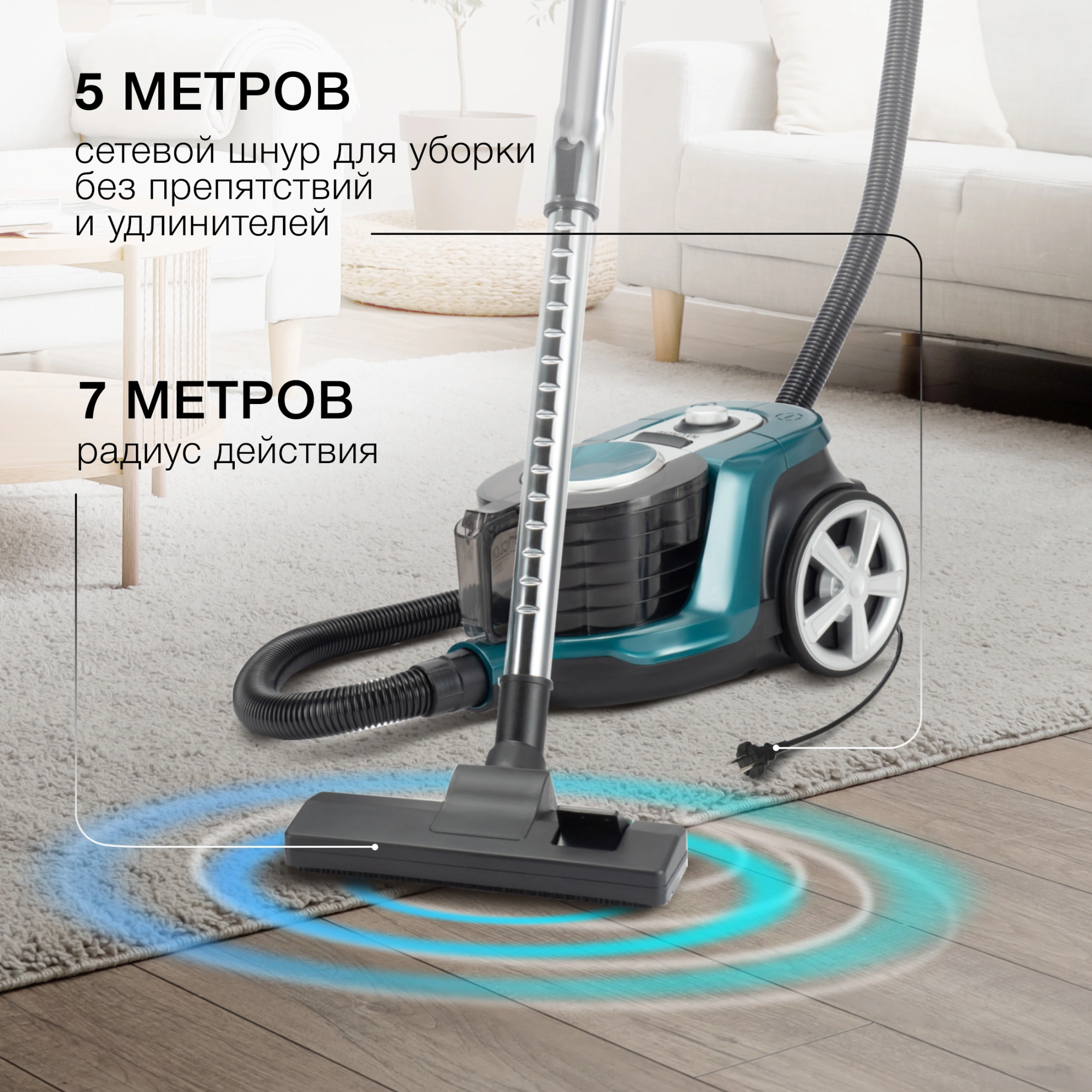 Провод питания Hyundai HYV-C3950 имеет оптимальную для уборки длину 5 м. С одной стороны, её хватает, чтобы не привязываться слишком близко к розетке, с другой – кабель не будет мешать под ногами. Для шнура внутри Hyundai HYV-C3950 предусмотрена катушка. Сматывание на неё срабатывает в автоматическом режиме по нажатию специальной кнопки.