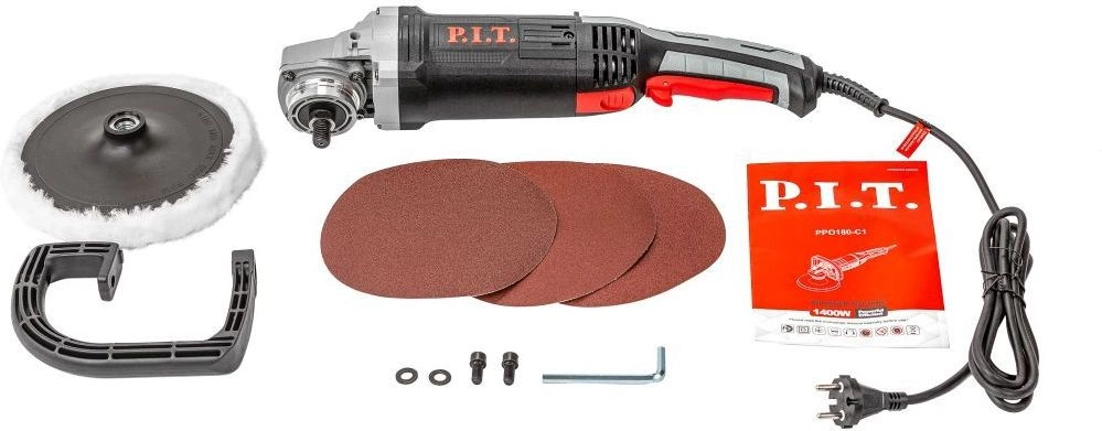 Шлифмашина полировочная, коробка, площадка круглая, круг шерстяной, круг наждачный, защитный кожух, ключ шестигранный, ключ зажимной, ручка дополнительная, инструкция по эксплуатации.