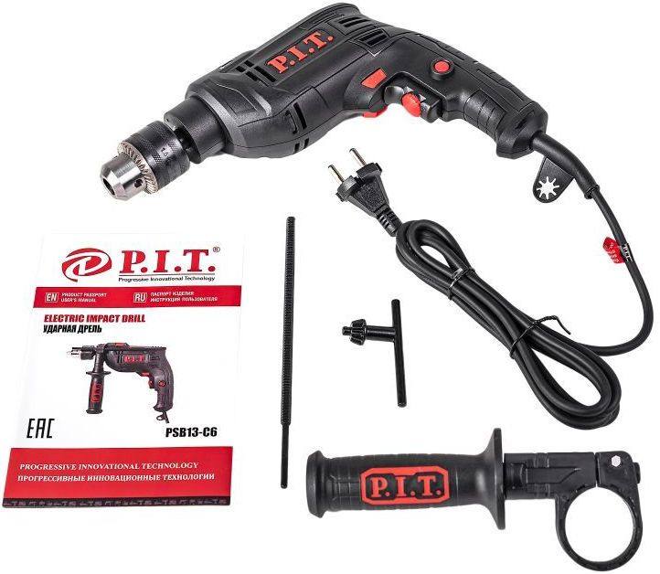 Дрель, коробка, рукоятка дополнительная, ограничитель глубины сверления, ключ патрона, руководство по эксплуатации.
