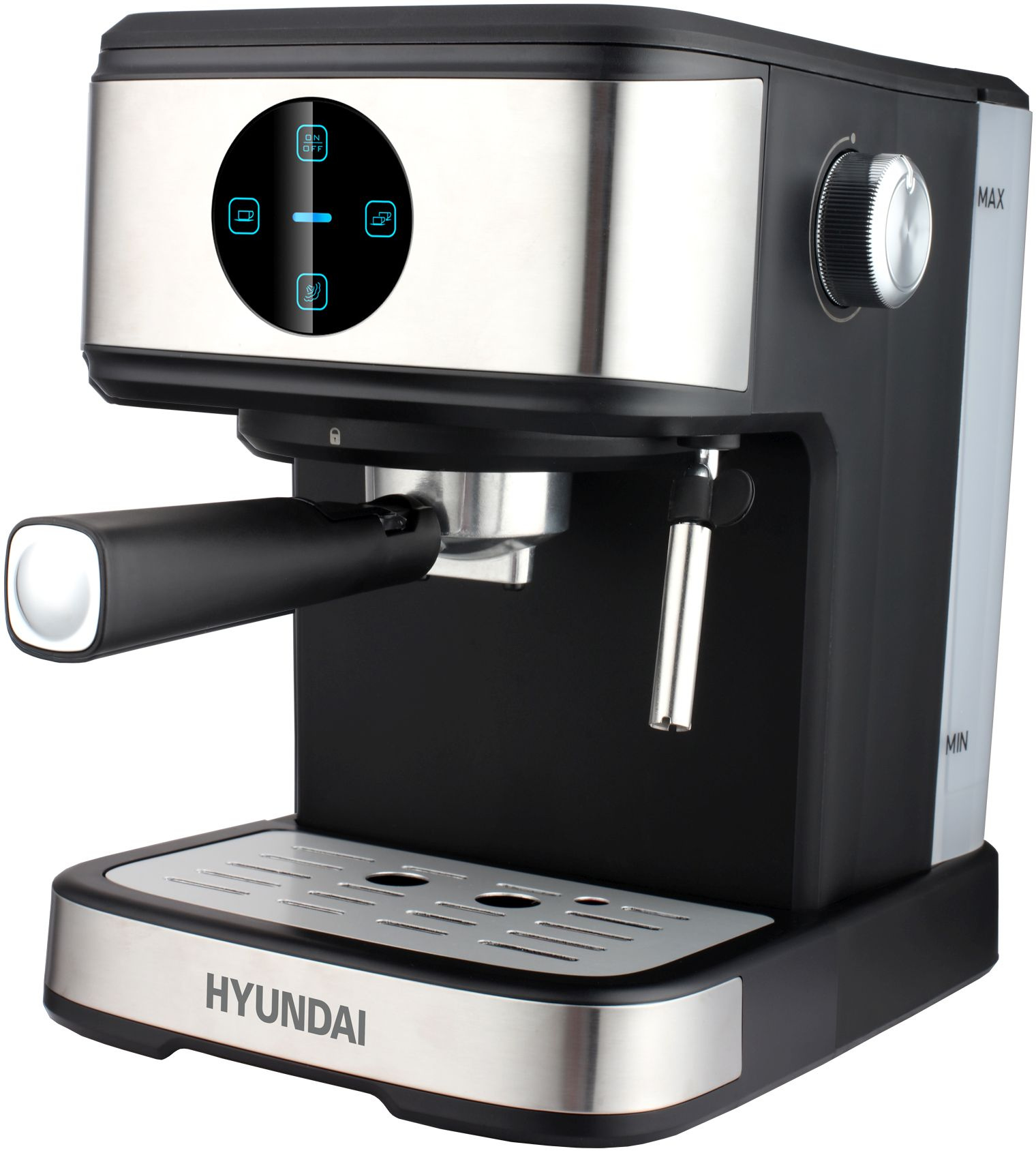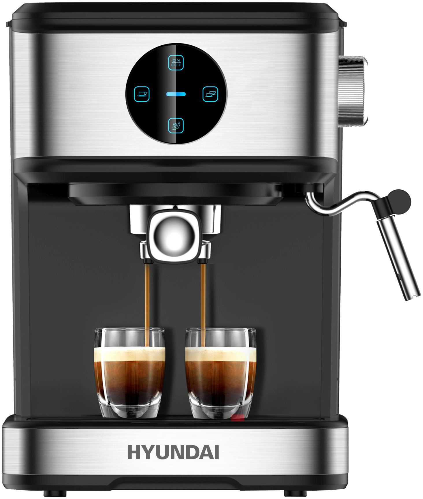 Управление в девайсе выполнено интуитивно: чтобы начать приготовление, достаточно нажать на одну из частей яркой и удобной тач-панели. Всего режимов на ней предусмотрено 3: на одну чашку, на две и капучинатор. Последняя опция позволяет превращать молоко в плотную воздушную пену при помощи пара. Также Hyundai HEM-3312 может подогревать чашки, что способствует сохранению вкуса напитка.