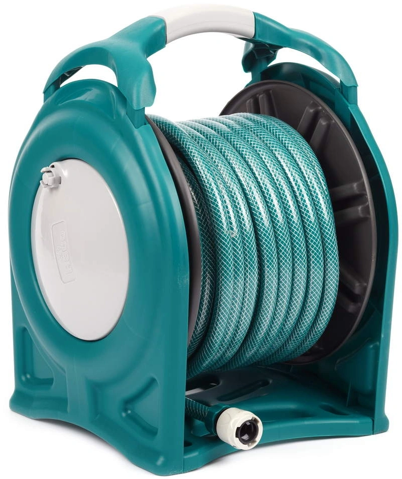 --Катушка для шланга поставляется в собранном виде и комплектуется всеми необходимыми для подключения фитингами.; -Компактность катушки обеспечивает дополнительное удобство при хранении шланга и поливочной арматуры.; -Удобная двухкомпонентная рукоятка для быстрой смотки шланга на катушку.