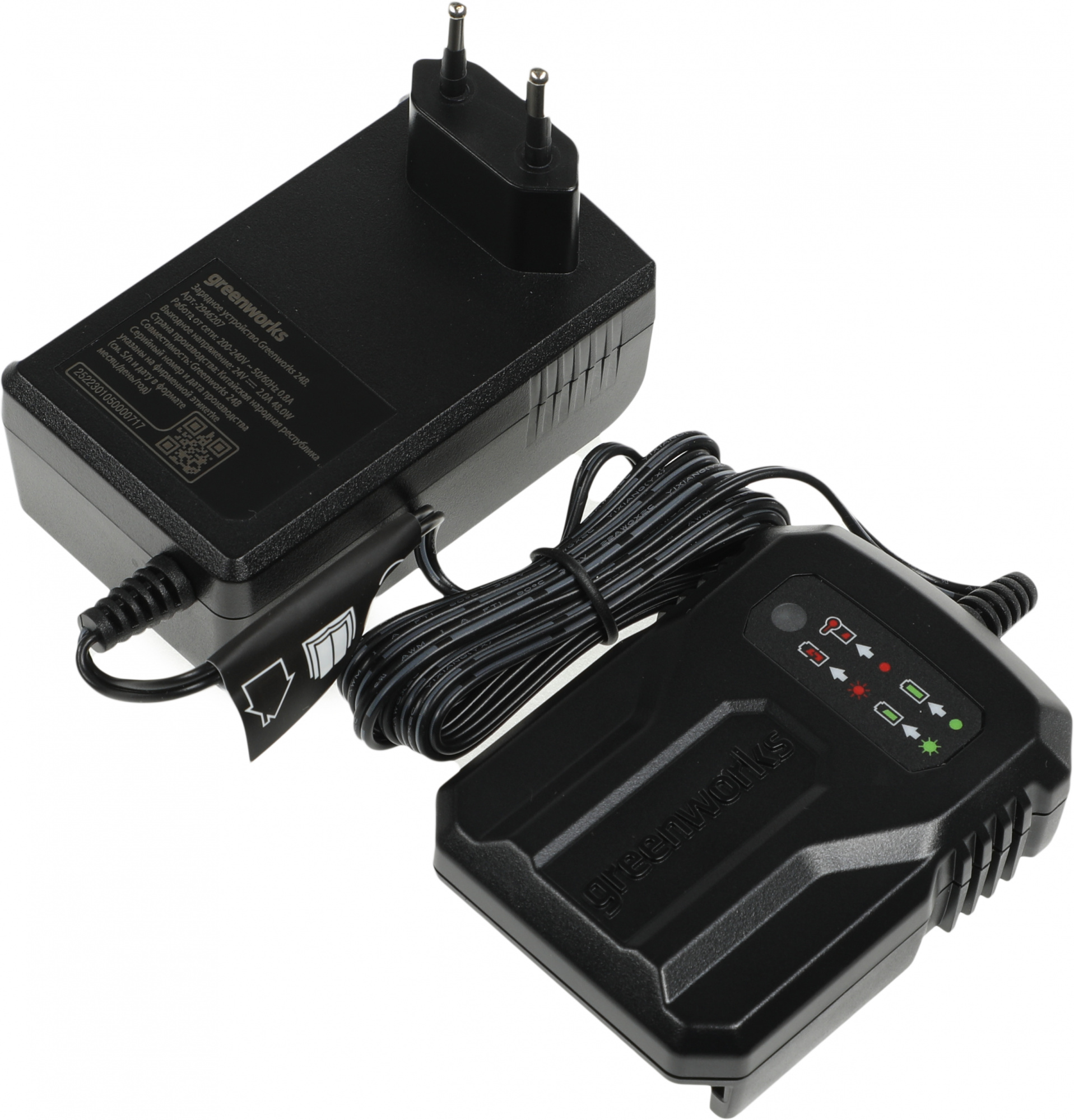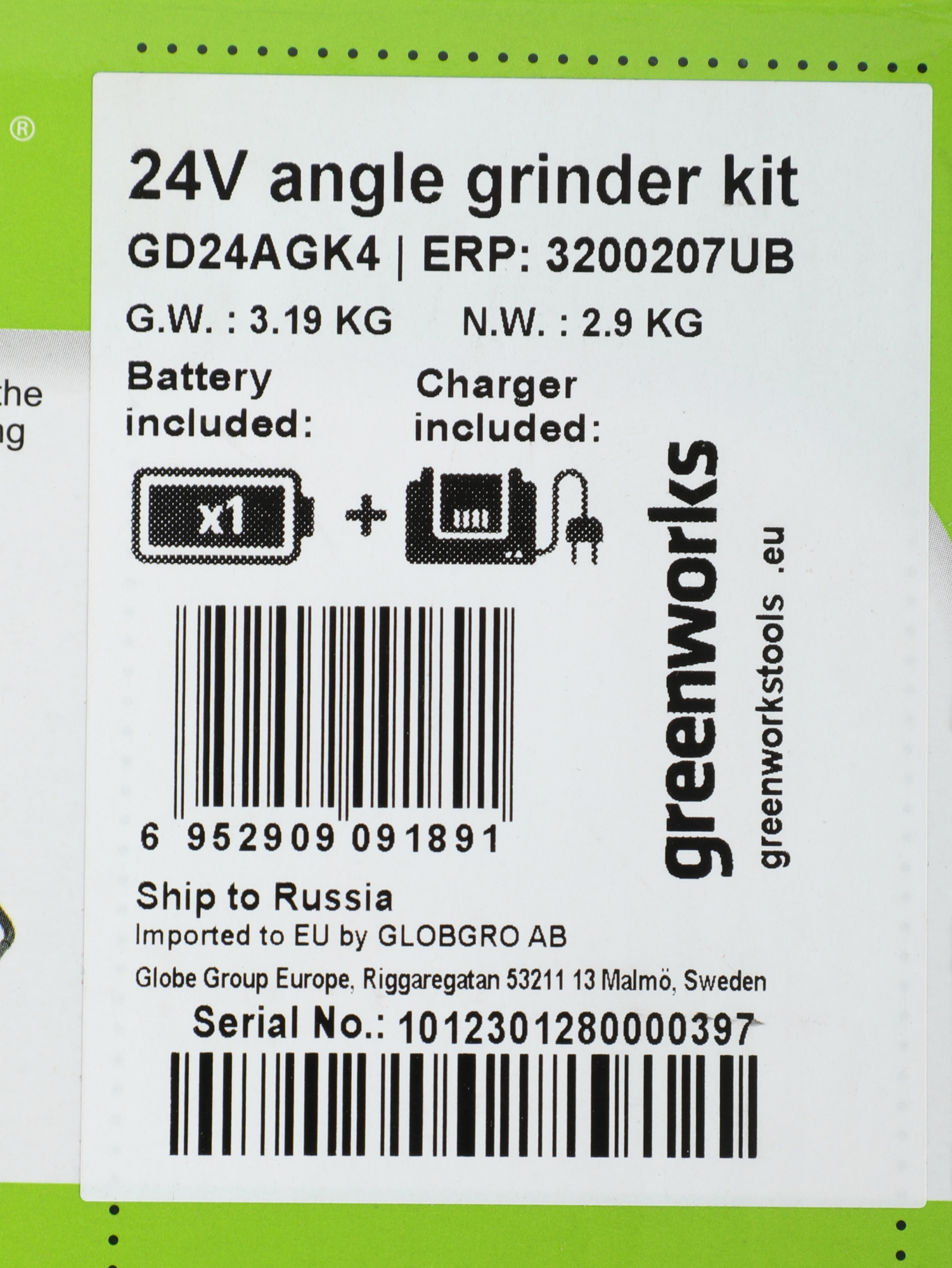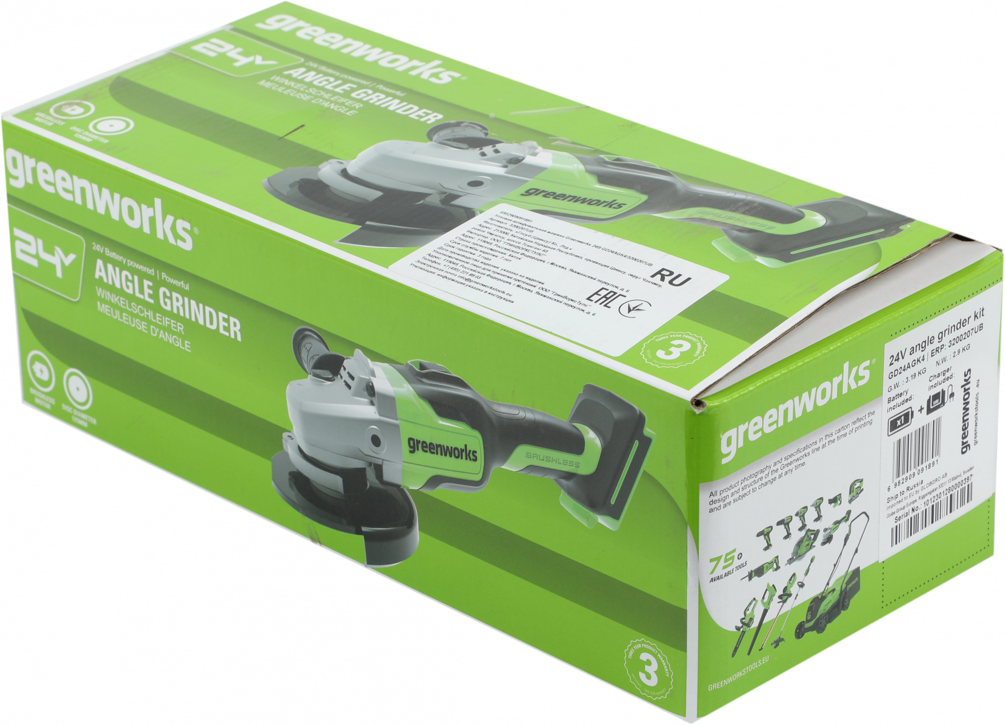 Угловая шлифовальная машина (болгарка) Greenworks 24V, арт. 3200207; боковая рукоятка; ключ для монтажа диска; аккумулятор Greenworks, 24V, 4 Ач; зарядное устройство Greenworks 24V, 4А; руководство по эксплуатации; гарантийный талон; удобная сумка-переноска.