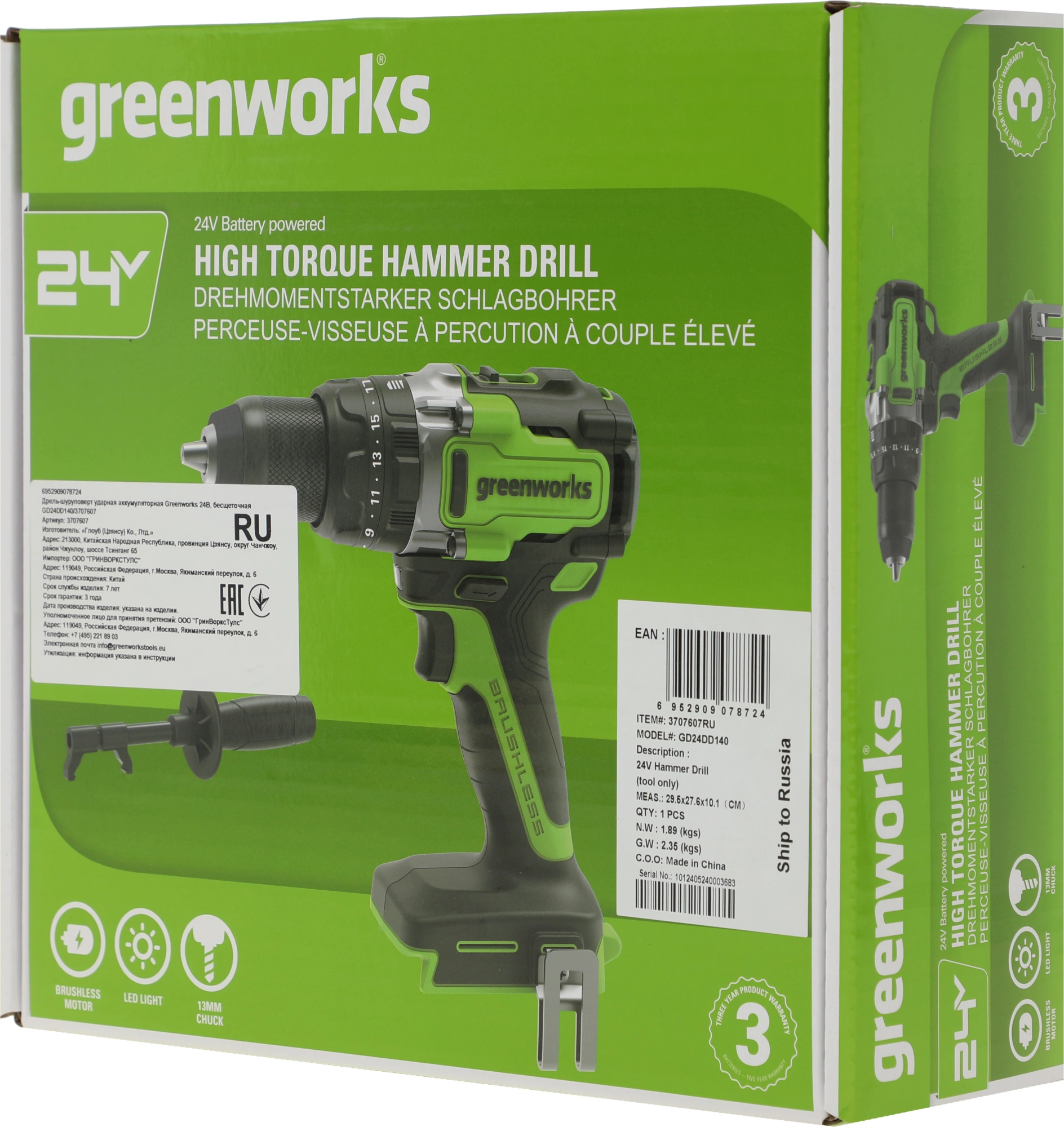 Дрель-шуруповерт аккумуляторная Greenworks D24DD140 24V, крепеж, руководство пользователя, упаковка.