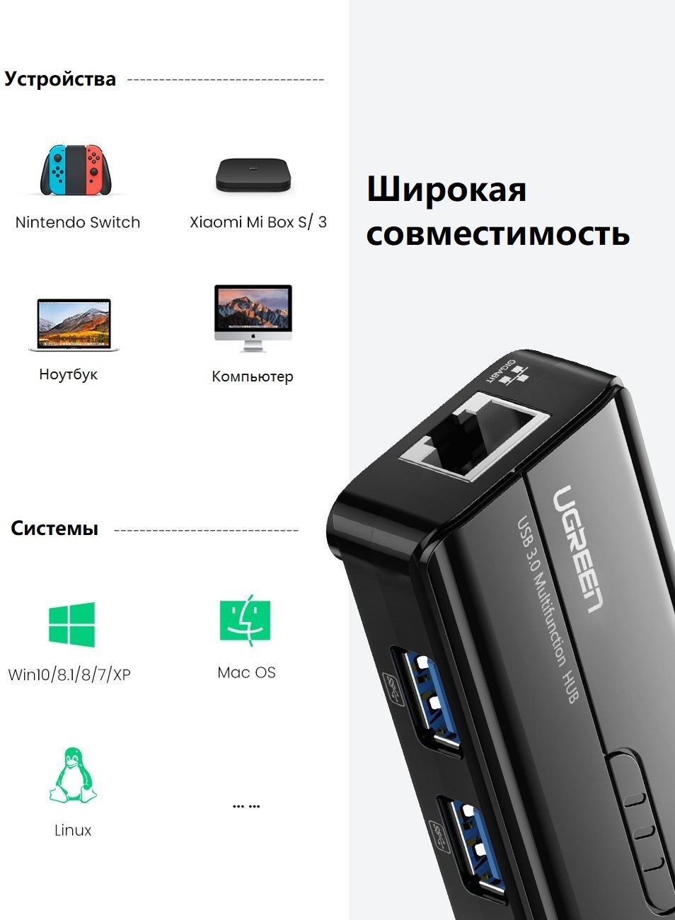 USB-хаб Ethernet позволяет подключать к вашему ПК или ноутбуку до 3 устройств с поддержкой USB A, например, внешний жесткий диск, USB флэш-накопитель, мышь, клавиатуру, USB наушники, динамики, USB камеру и т. д.