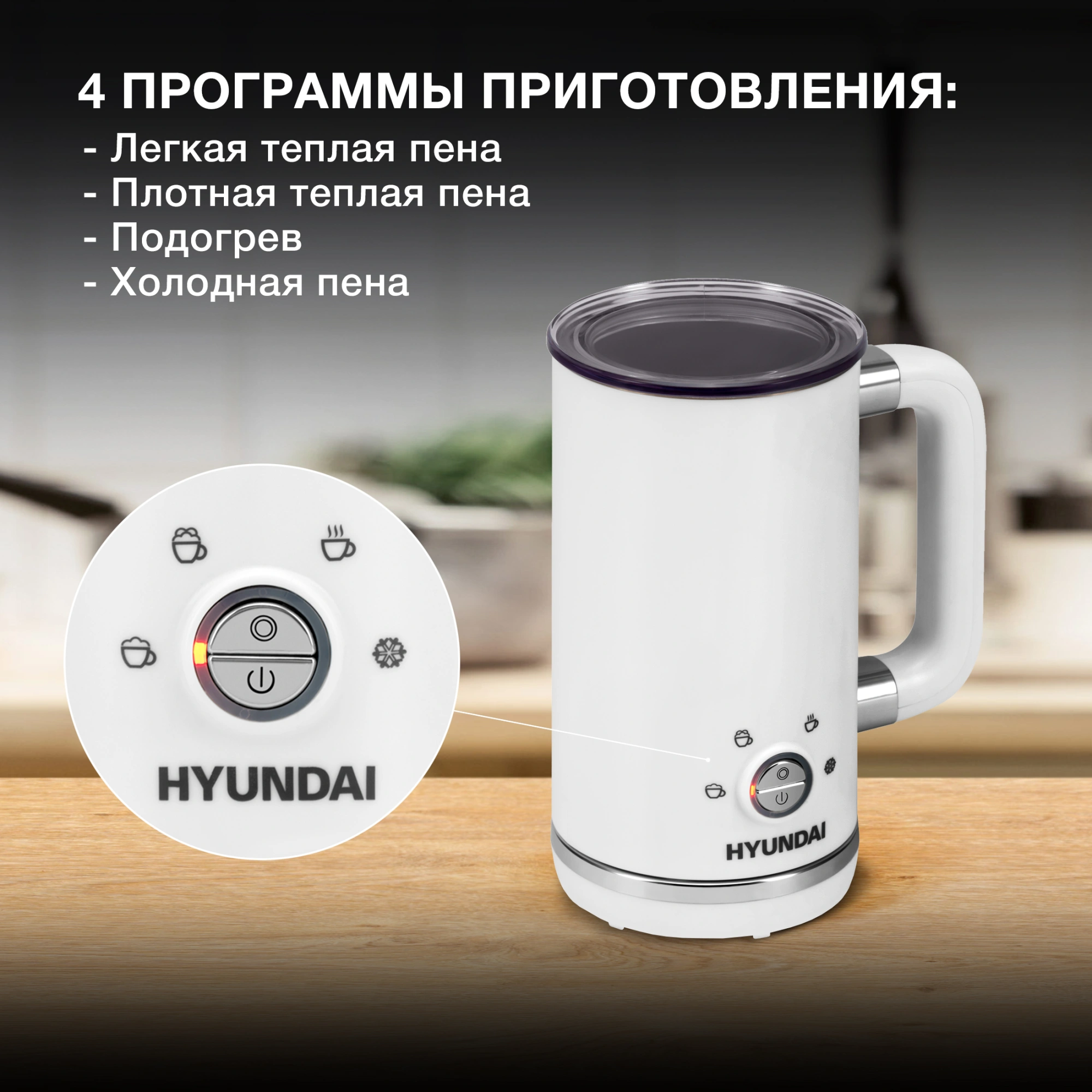 Капучинатор Hyundai HMF-P200 поможет взбить восхитительную молочную пену для капучино, латте макиато, кофе глясе и других напитков. Достаточно выбрать одну из четырех программ: «Легкую теплую пену», «Плотную теплую пену», «Холодную пену» или «Подогрев». Последний режим позволит согреть молоко для приготовления какао, а также молочных напитков с медом и пряностями. Объем чаши составляет 300 мл, чтобы сделать вкусную молочную пену сразу для нескольких порций кофе. На внутренней стенке капучинатора есть отметки, которые помогут определить нужное количество молока.