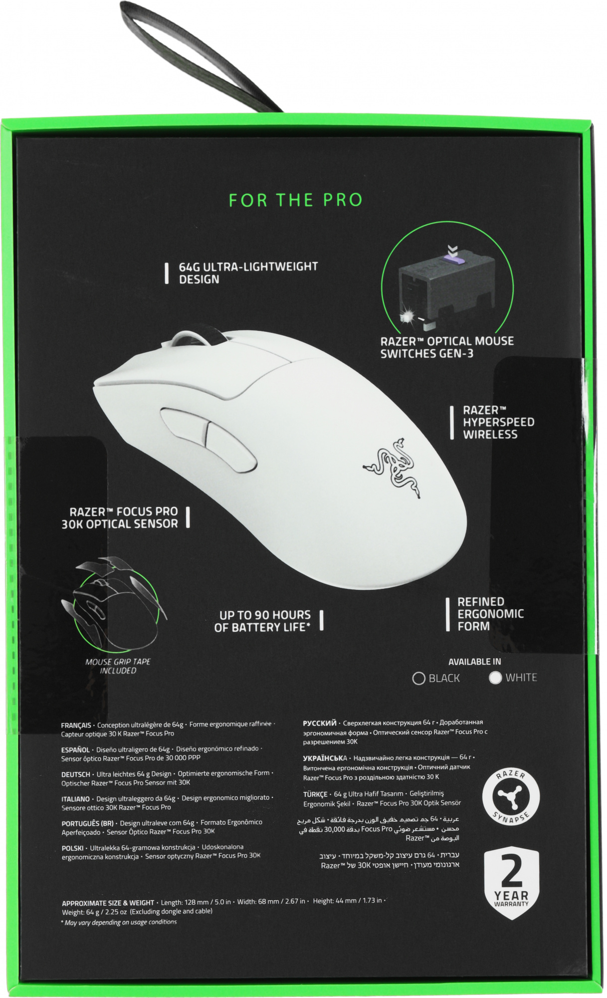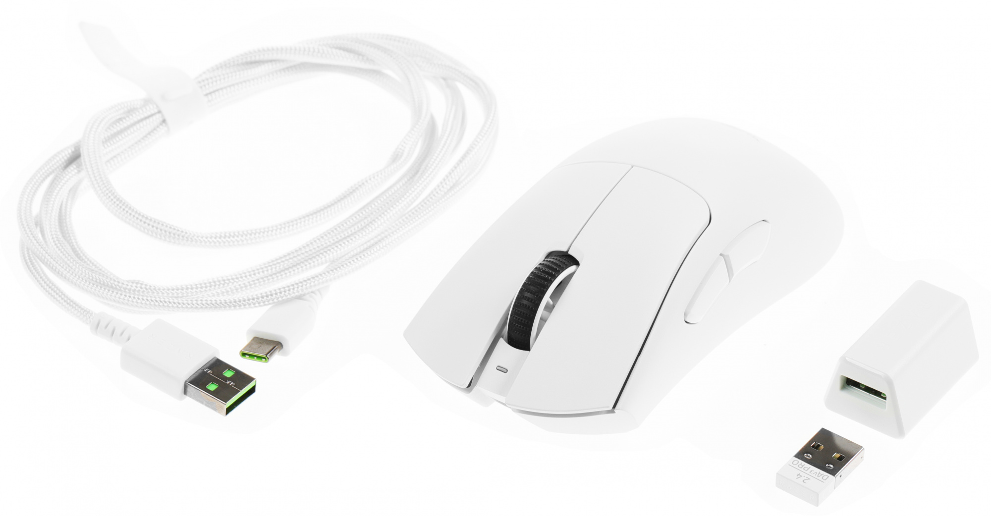 Беспроводная связь Razer Hyperspeed или проводной режим. 5 программируемых кнопок. Сверхлегкая 63 грамма. Оптический сенсор Razer Focus Pro 30 000 DPI.