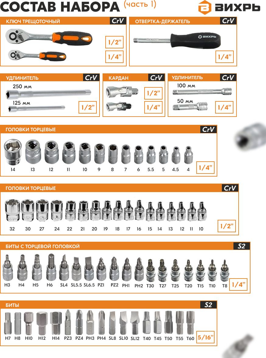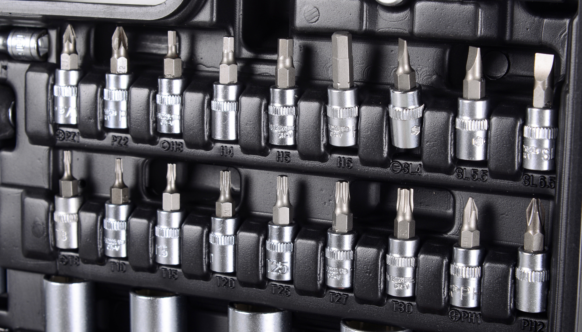 Биты с торцевыми головками: Н3, 4, 5, 6; Т8, Т10, Т15, Т20, Т25, Т27, Т30; SL4, SL5.5, SL6.5; РН1, РН2; PZ1, PZ2