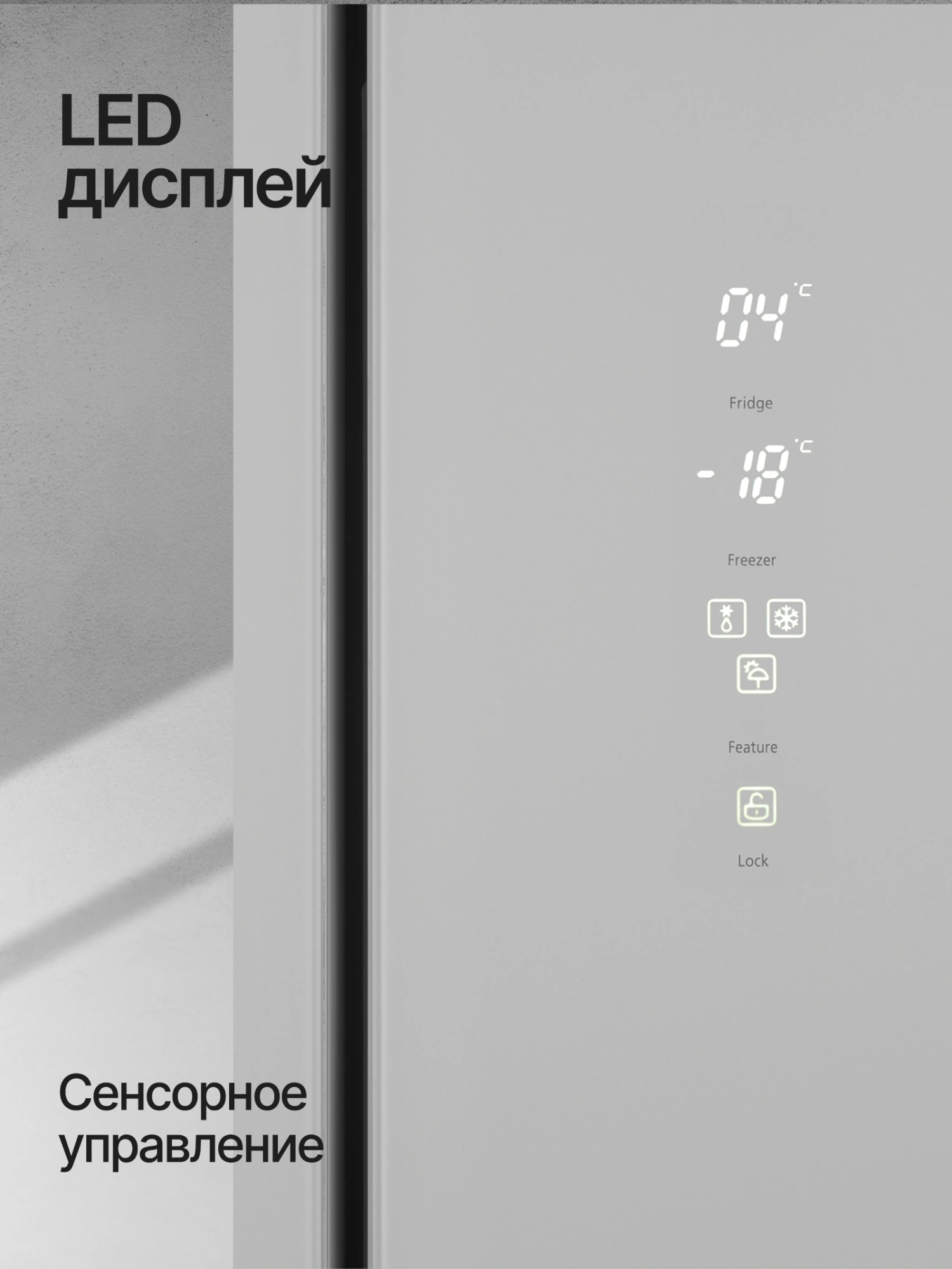 визуальная индикация отключения электропитания, звуковой сигнал незакрытой двери, температуры