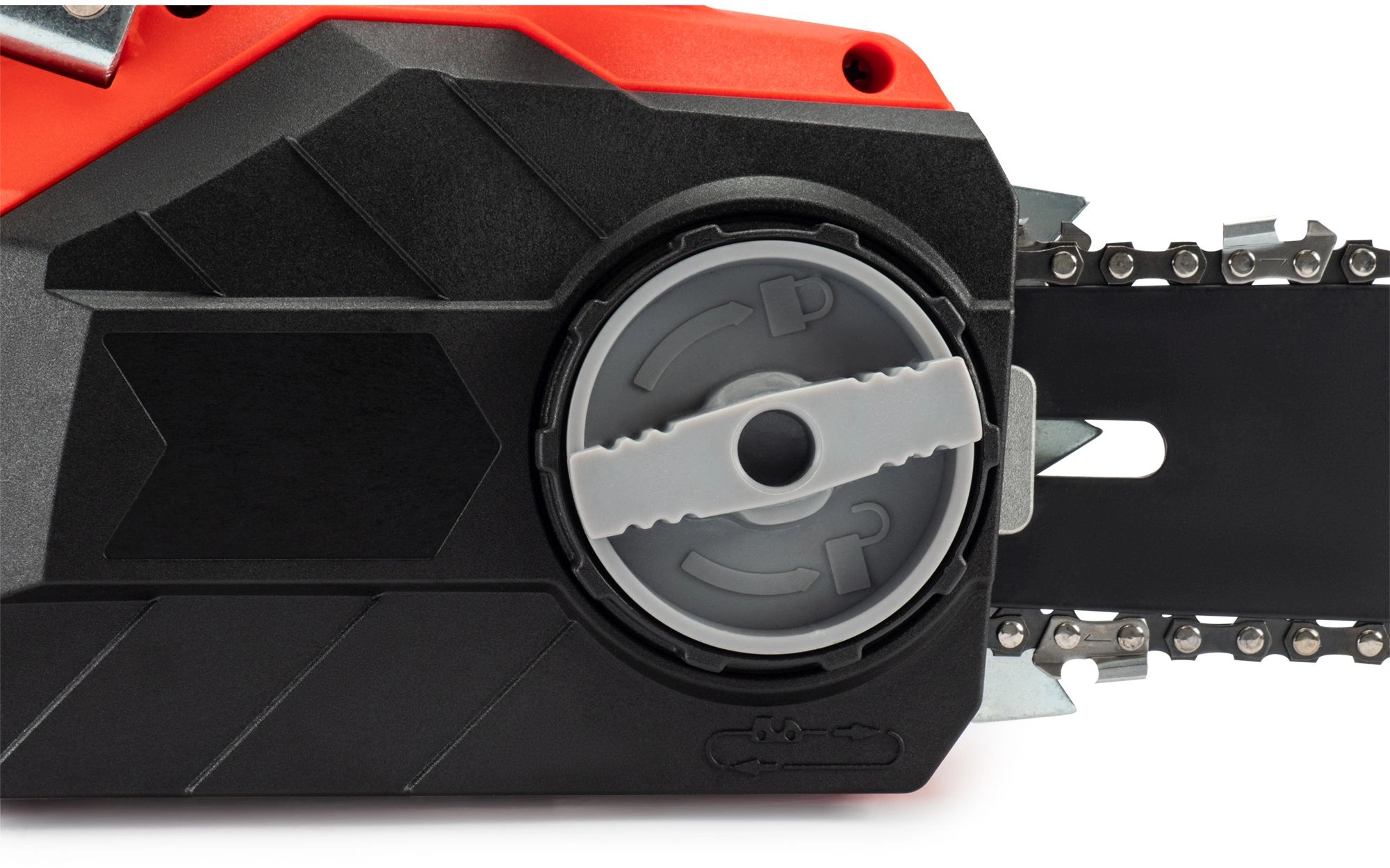 Благодаря пильной шине длиной 18 дюймов (45 см) достигается оптимальный баланс между маневренностью и производительностью, позволяя вам обрабатывать деревья различных размеров. Система бесключевого натяжения цепи упрощает работу и позволяет быстро подтянуть цепь без использования специальных ключей.