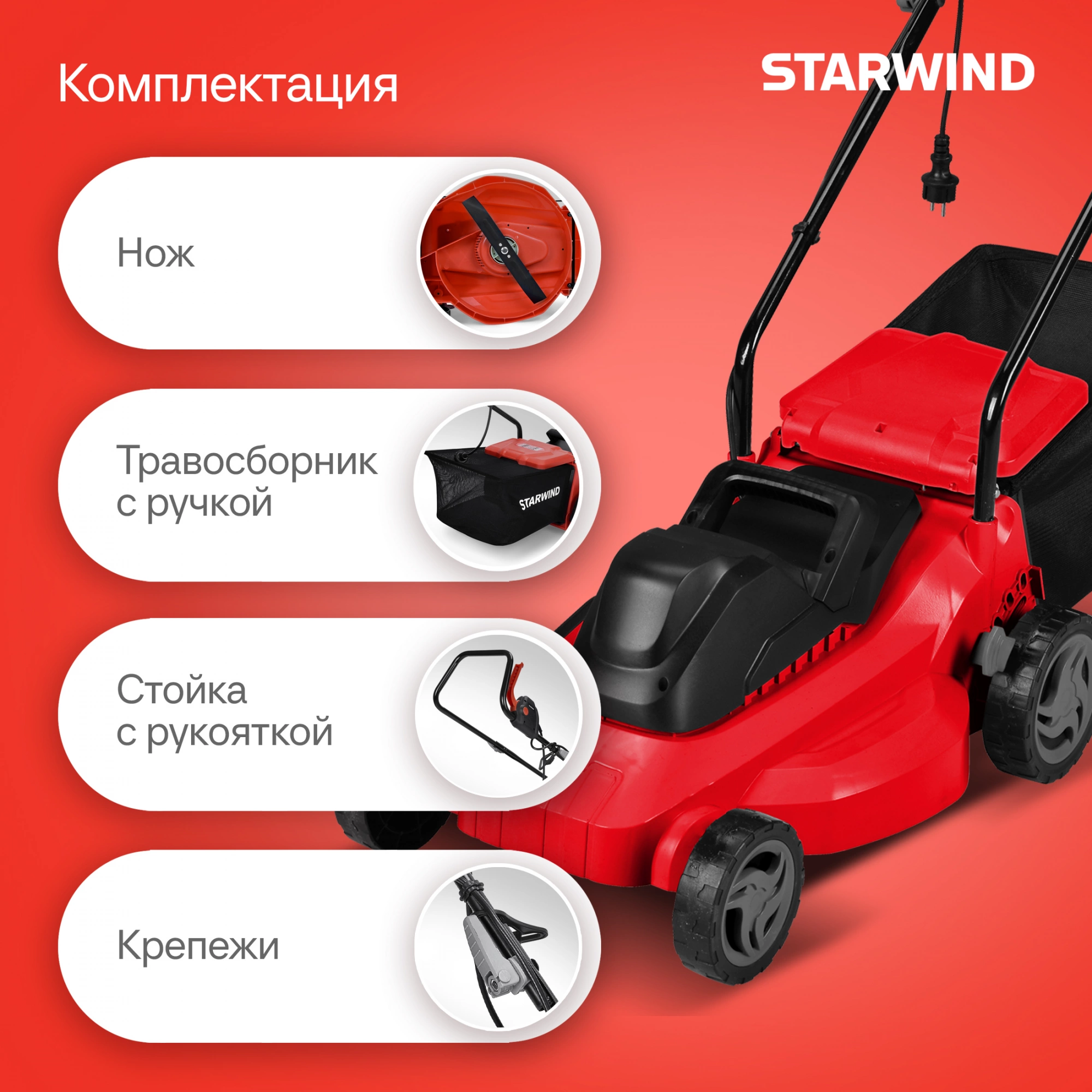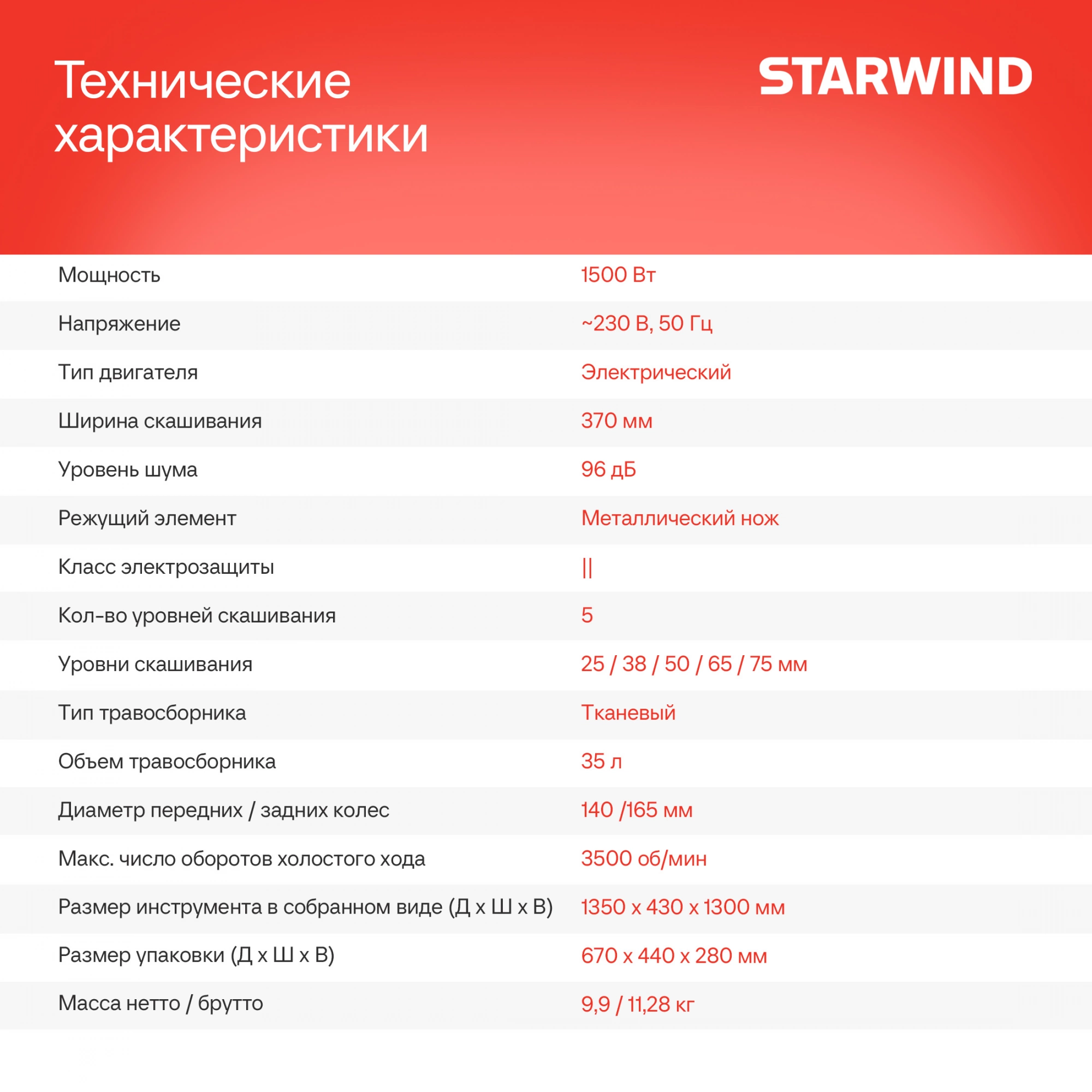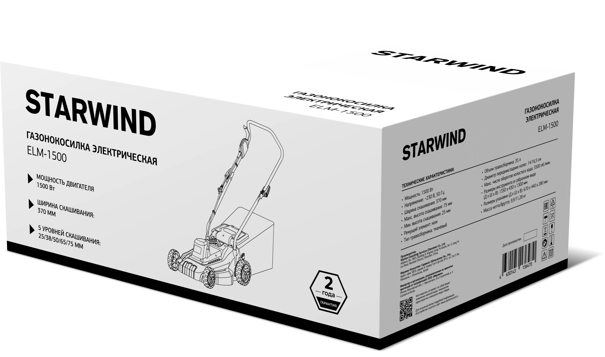 Starwind ELM-1500 – это надежное, эффективное и удобное решение для ухода за вашим газоном. Подарите своему газону идеальный вид с этой универсальной газонокосилкой!