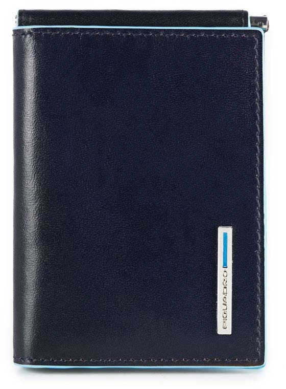 Портмоне из натуральной кожи синего цвета с контрастным голубым кантом и фирменным тиснением с логотипом бренда. Имеется шесть отделений для карт, карман для документов, зажим для купюр.