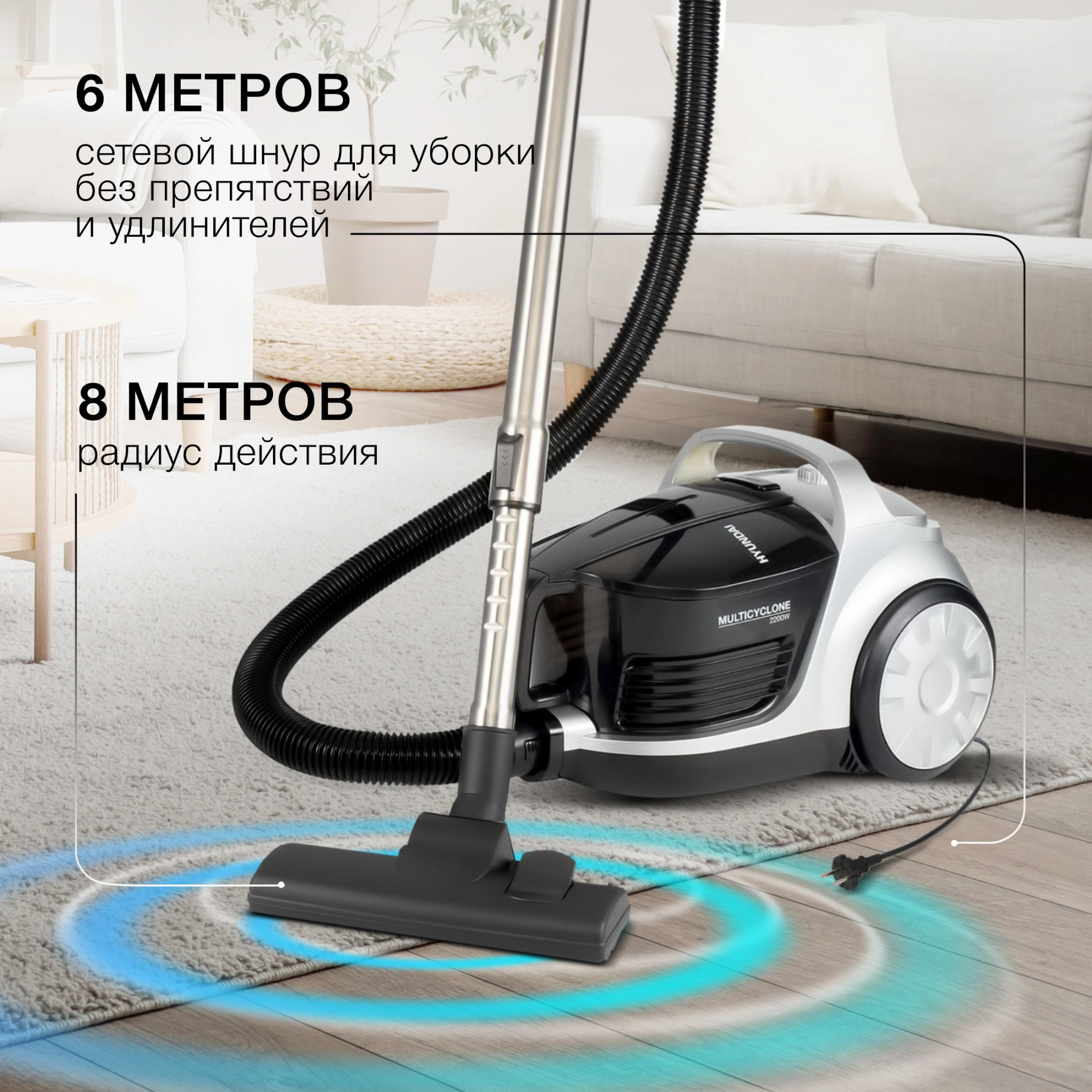 Hyundai HYV-C2650 оснащён качественной системой фильтрации, использующей технологию мультициклона. Она делает возможным улавливание не только крупного мусора, но и мелкой пыли во время уборки.