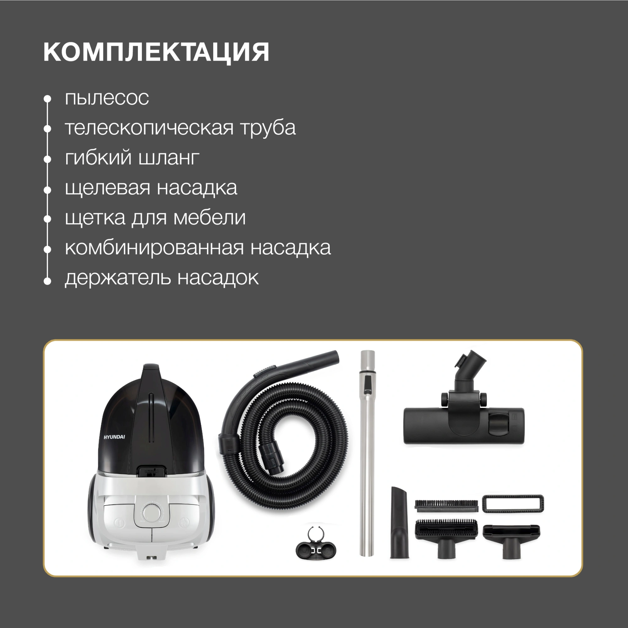 Hyundai HYV-C2650 работает с контейнером для пыли, а объём его пылесборника составляет 3.5 л и, как следствие, не требует опорожнения после каждого использования устройства.