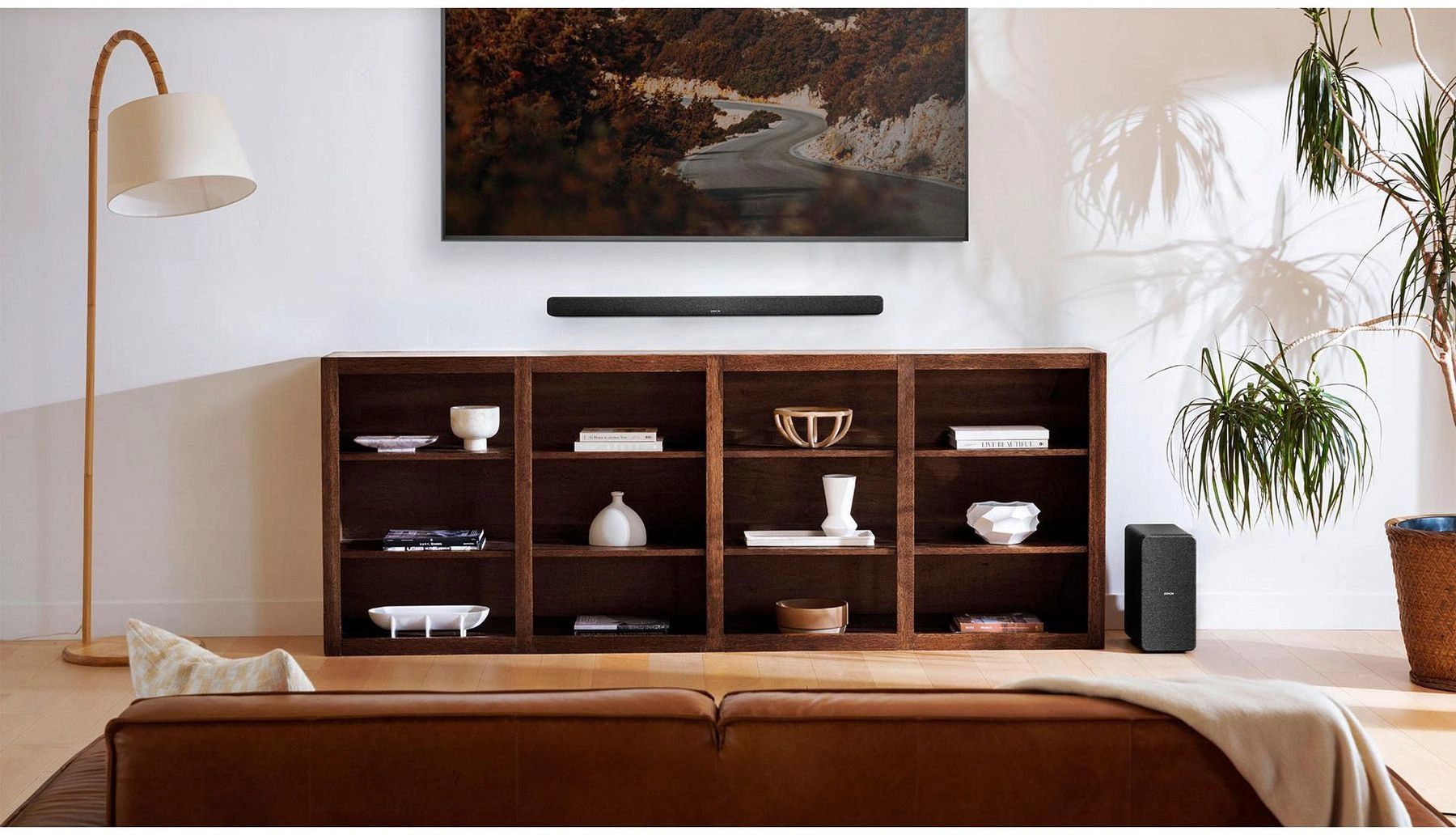 Сверхтонкий саундбар 3.2.1(7 динамиков) с внешним беспроводным сабвуфером, поддержкой объемного звука Dolby Atmos, eARC и Bluetooth и возможностью крепления на стену