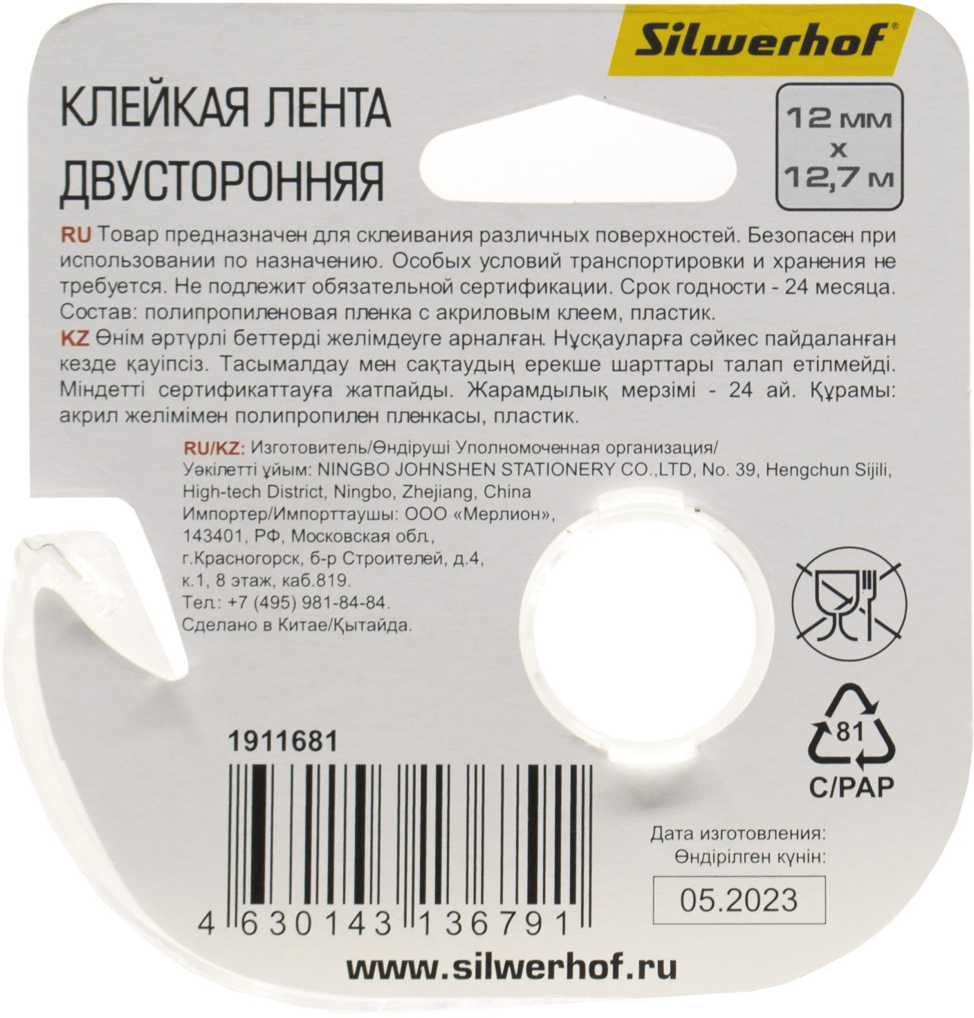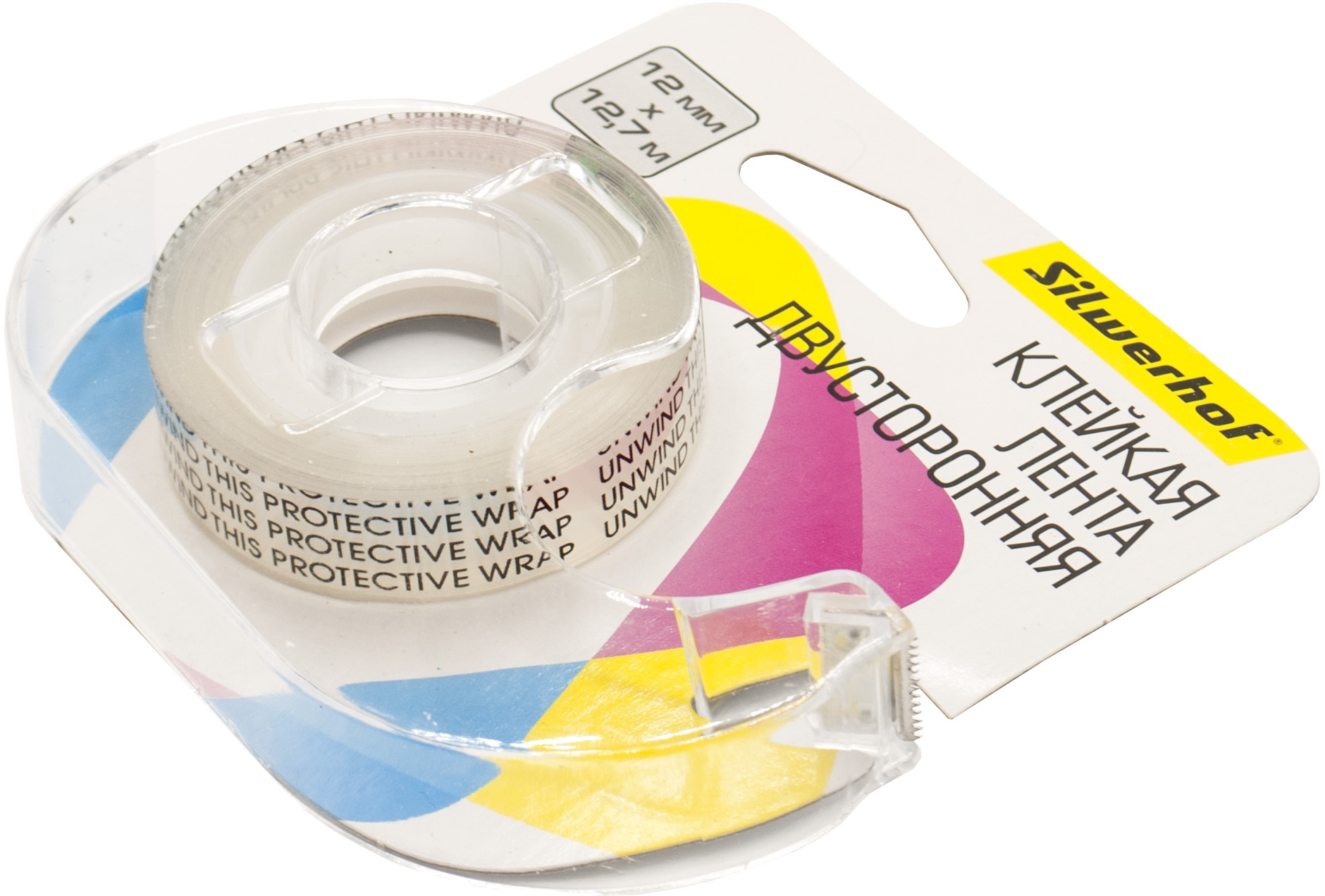 Клейкая лента двухсторонняя Silwerhof прозрачная шир.12мм дл.12.7м полипропилен на диспенсере