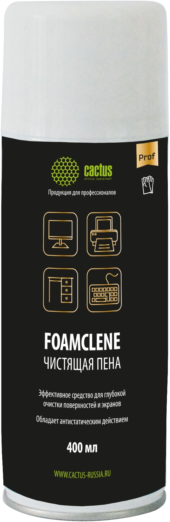 Cactus FOAMCLENE - это эффективное средство для глубокой очистки различных типов поверхностей: пластиковых, металлических, керамических, стеклянных, а также LCD, TFT экранов, терминалов, графических столов, зеркал и пр. FOAMCLENE содержит специальные растворяющие вещества, способствующие удалению пыли, жира, грязи, отпечатков пальцев, никотинового налета и других въевшихся загрязнений. Обладает антистатическим действием, благодаря чему предотвращает появление новых загрязнений. Мягко очищает и не царапает поверхности, безопасен в использовании.