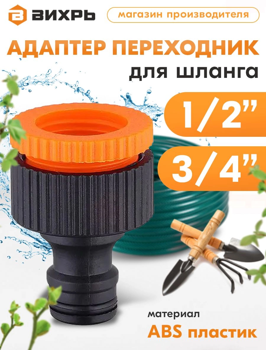 Адаптер-переходник для садового шланга Вихрь с 1/2" на 3/4". Материал: пластмасса, резиновые прокладки на местах соединения.