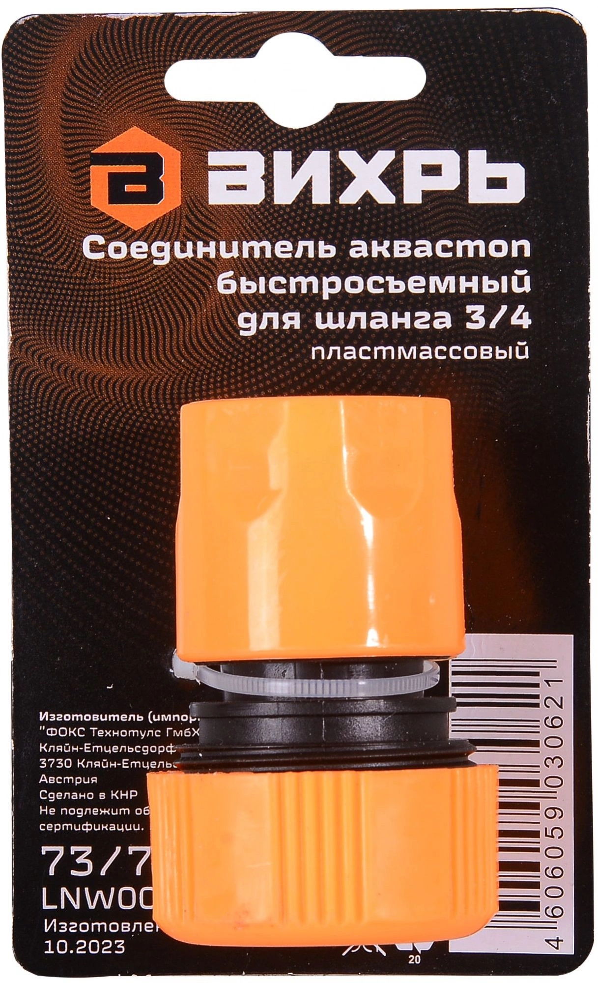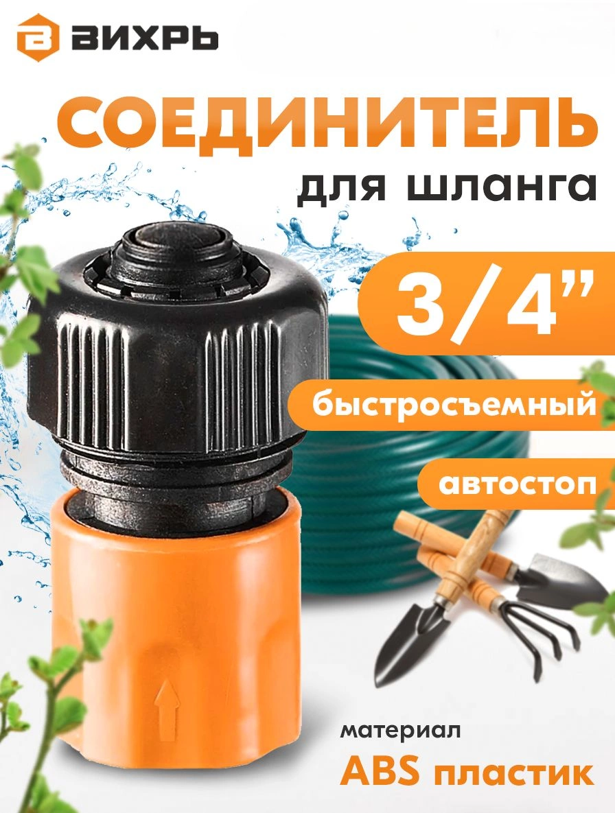 Соединитель аквастоп быстросъемный для шланга 3/4. Функция аквастоп позволяет перекрывать поток воды при отсоединений шланга от пистолета-распылителя.