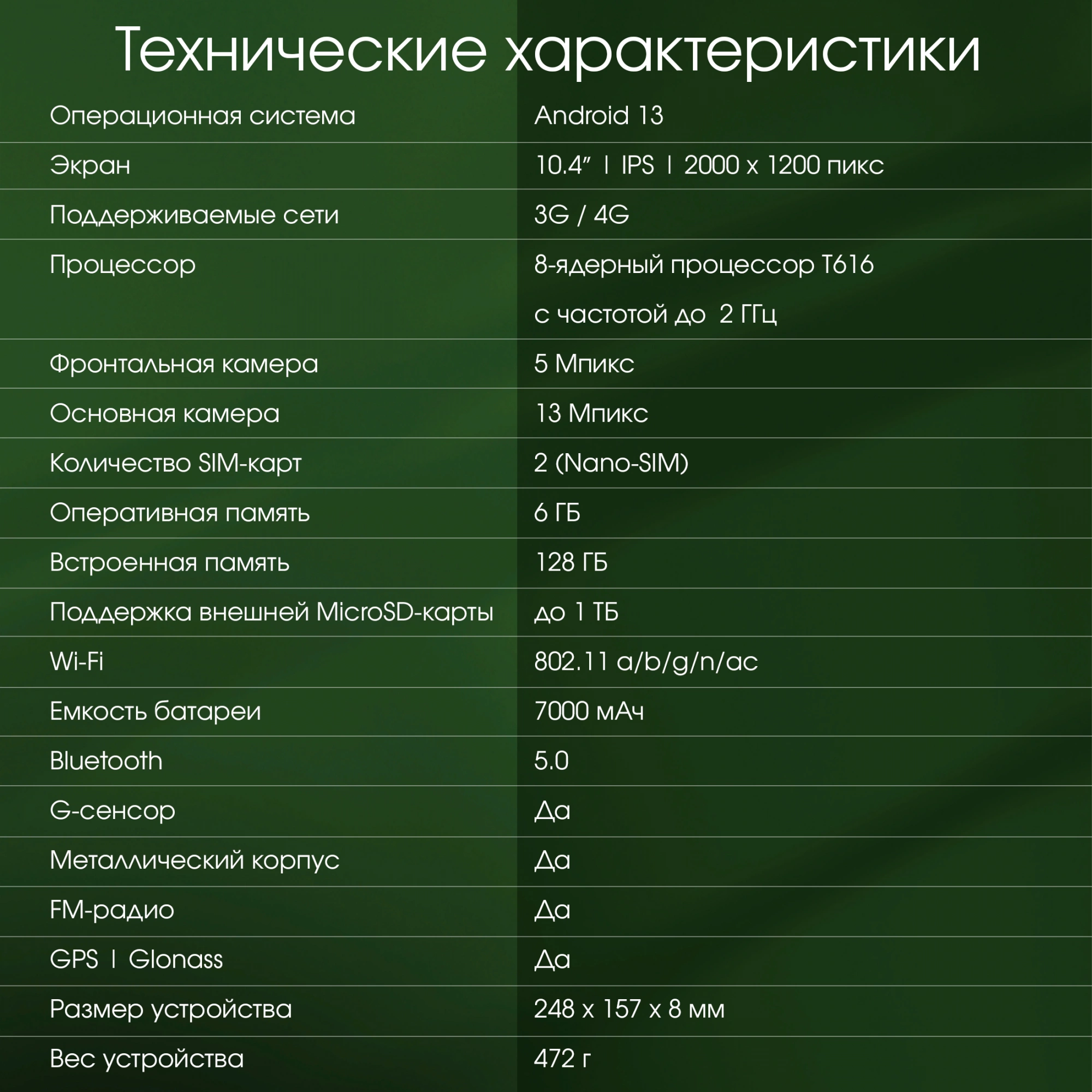 Планшет работает на ОС Android 13. Имеются встроенные модули Wi-Fi, Bluetooth 5.0, GPS/ГЛОНАСС. Можно установить две сим-карты Nano-SIM. Есть аудиоразъем для наушников. Модель оснащена мощным аккумулятором емкостью 7000 мАч. Предусмотрена быстрая зарядка через порт USB Type-C.