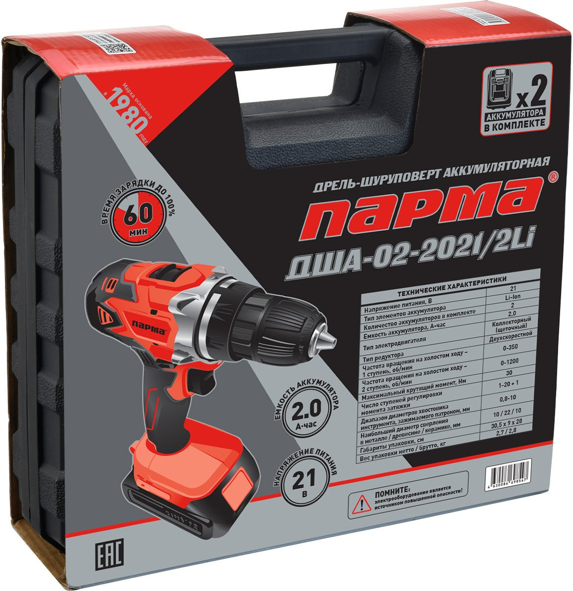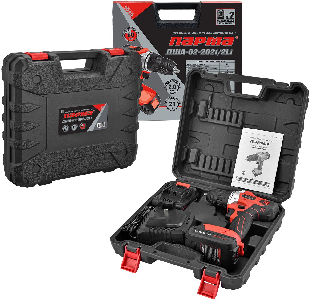 Дрель-шуруповерт, АКБ - 2 шт., ЗУ, кейс, бита.