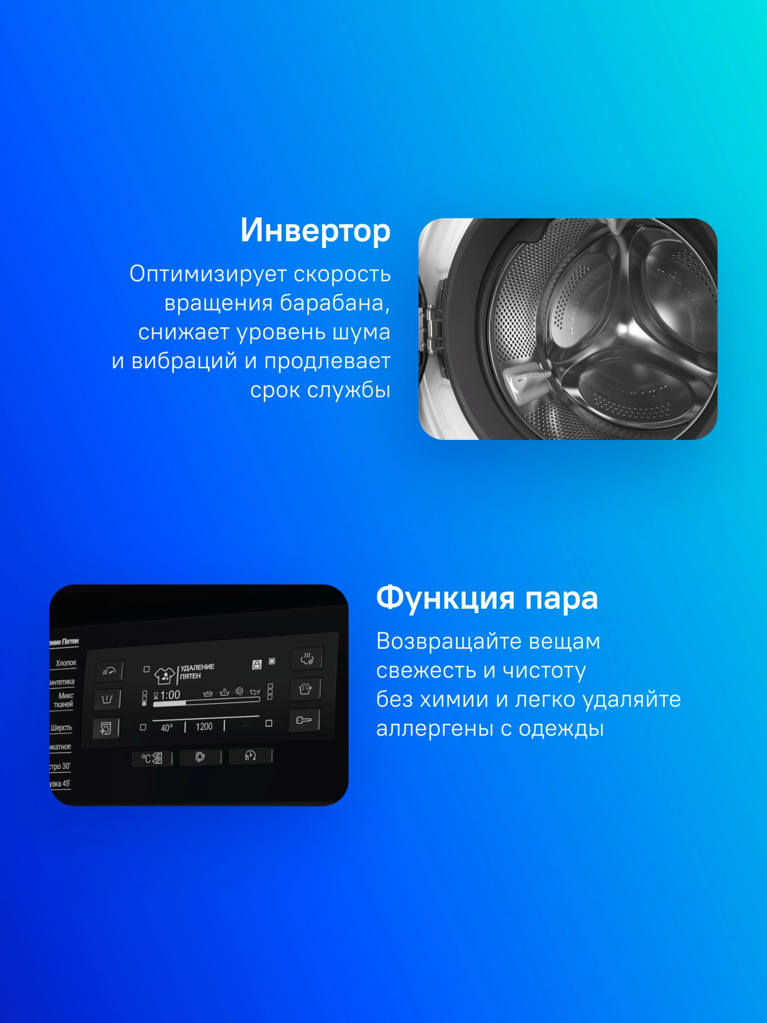 быстрая стирка, деликатная стирка, предварительная стирка, самоочистка