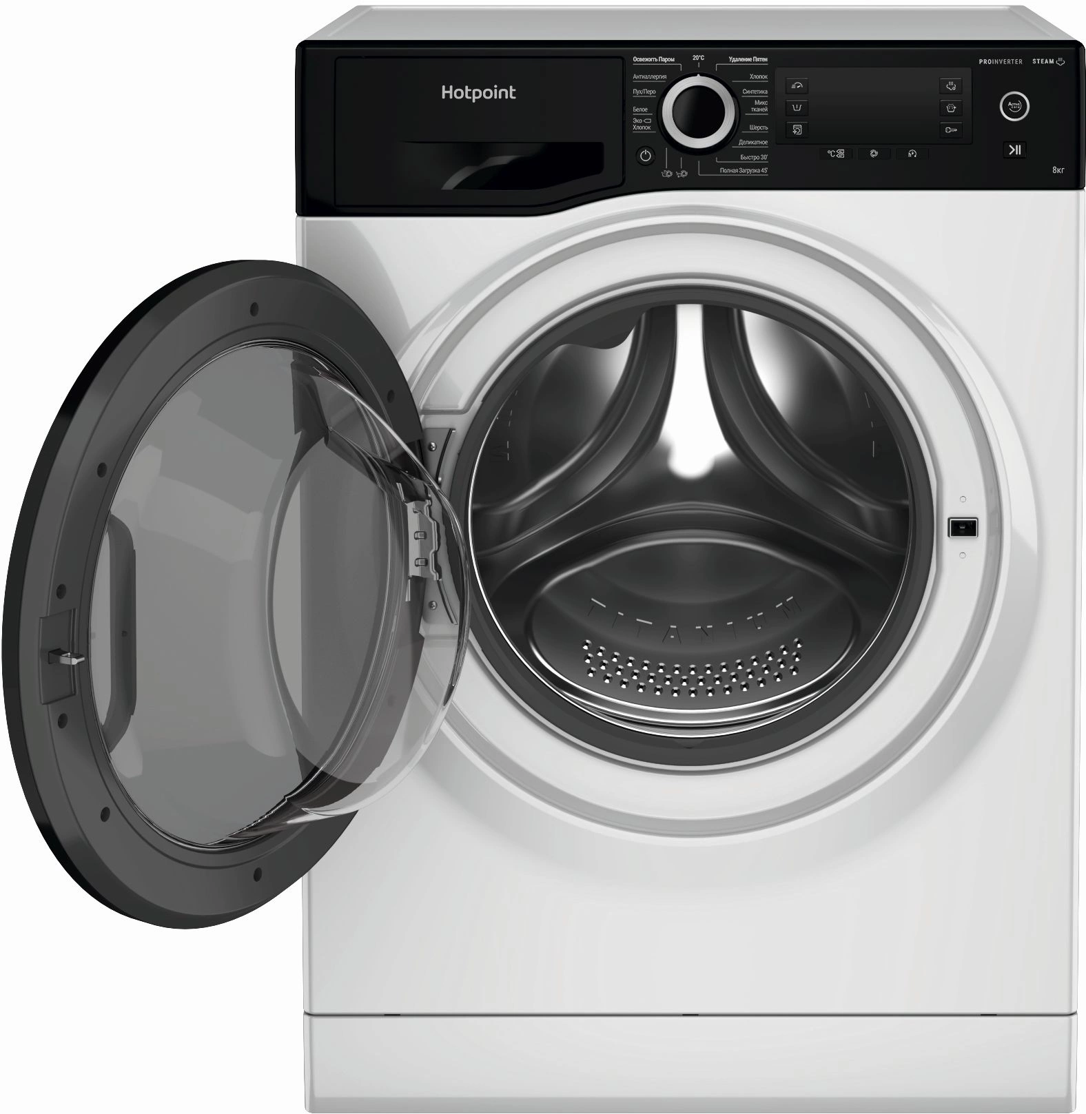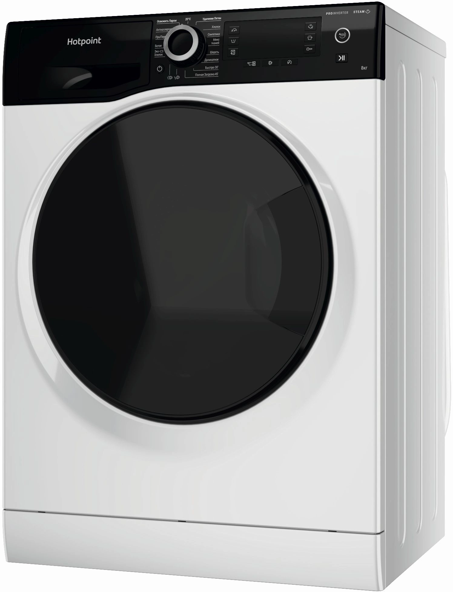 Освежить паром, 20°C, Удаление пятен, Хлопок, Синтетика, Микс тканей, Шерсть, Деликатное, Быстро 30’, Полная загрузка 45’, Антиаллергия, Пух/Перо, Белое, Эко Хлопок