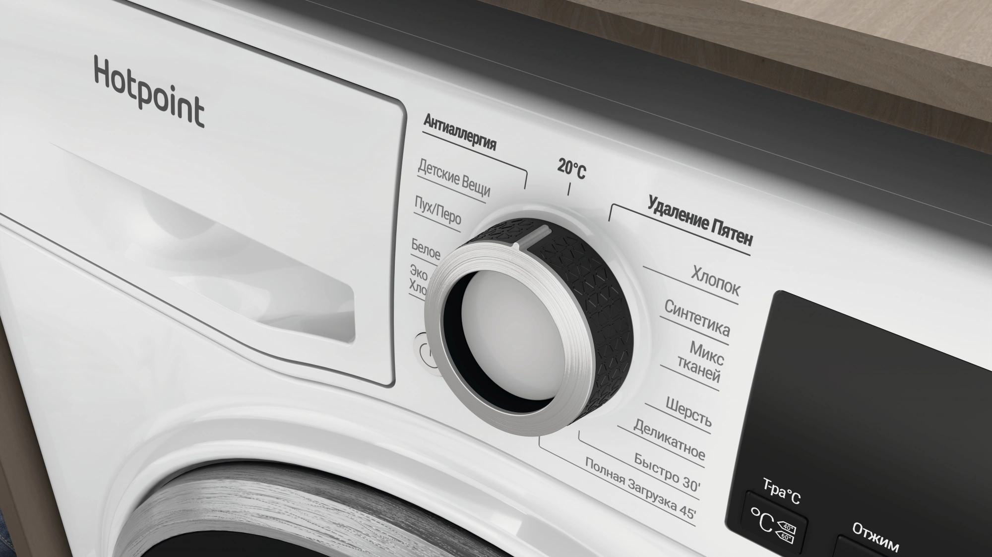 20°C, Удаление пятен, Хлопок, Синтетика, Микс тканей, Шерсть, Деликатное, Быстро 30’, Полная загрузка 45’, Детские вещи, Антиаллергия, Пух/Перо, Белое, Эко Хлопок