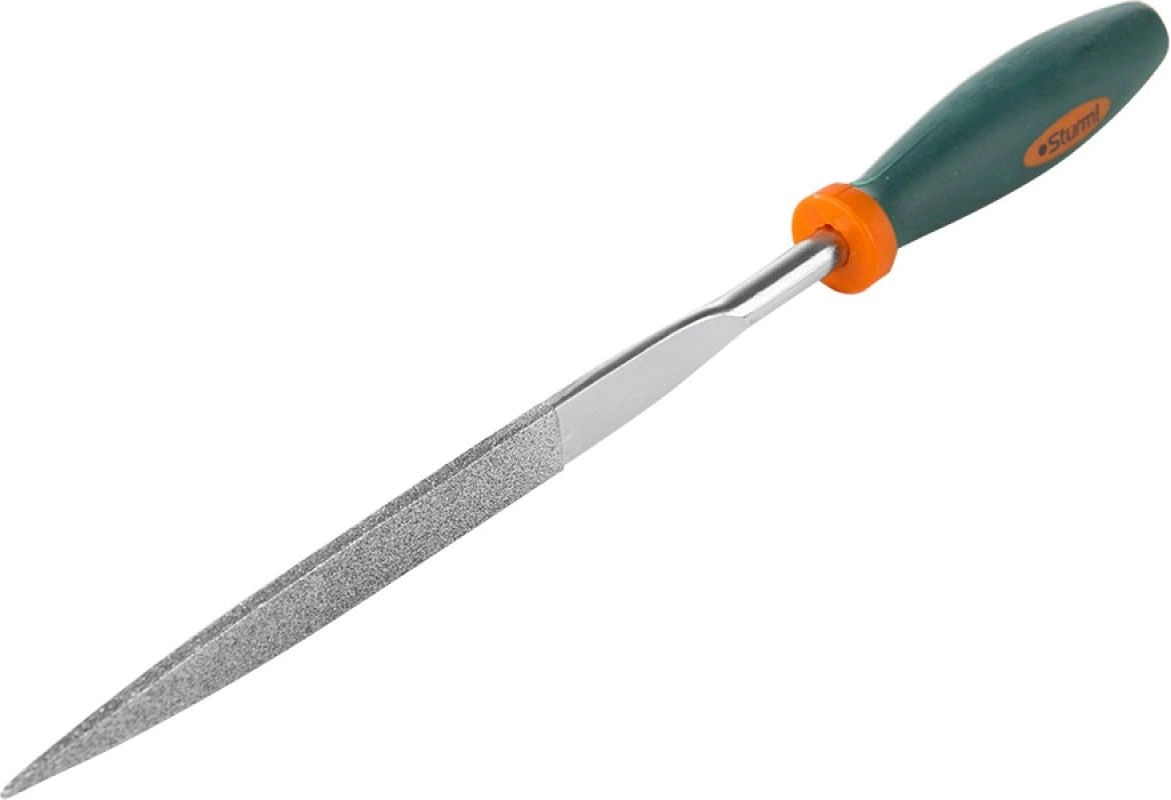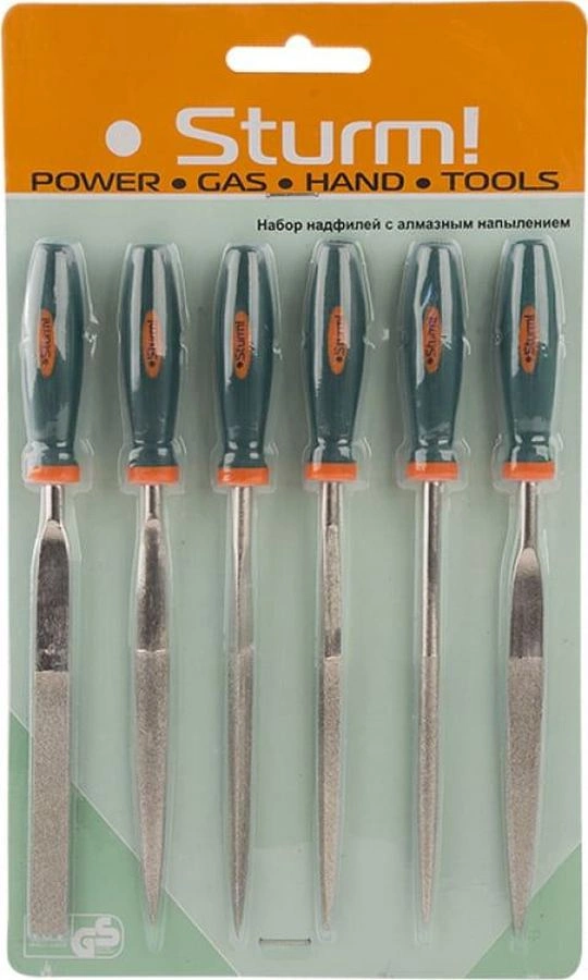 Набор надфилей Sturm! 1051-02-SSD: 6 шт. (треугольный, полукруглый, двояковыпуклый, плоский, квадратный, круглый), 100 мм. Алмазное напыление удобная двухкомпонентная рукоятка c хорошим сцеплением, двойная перекрестная насечка не оставляет бороздок на поверхности.