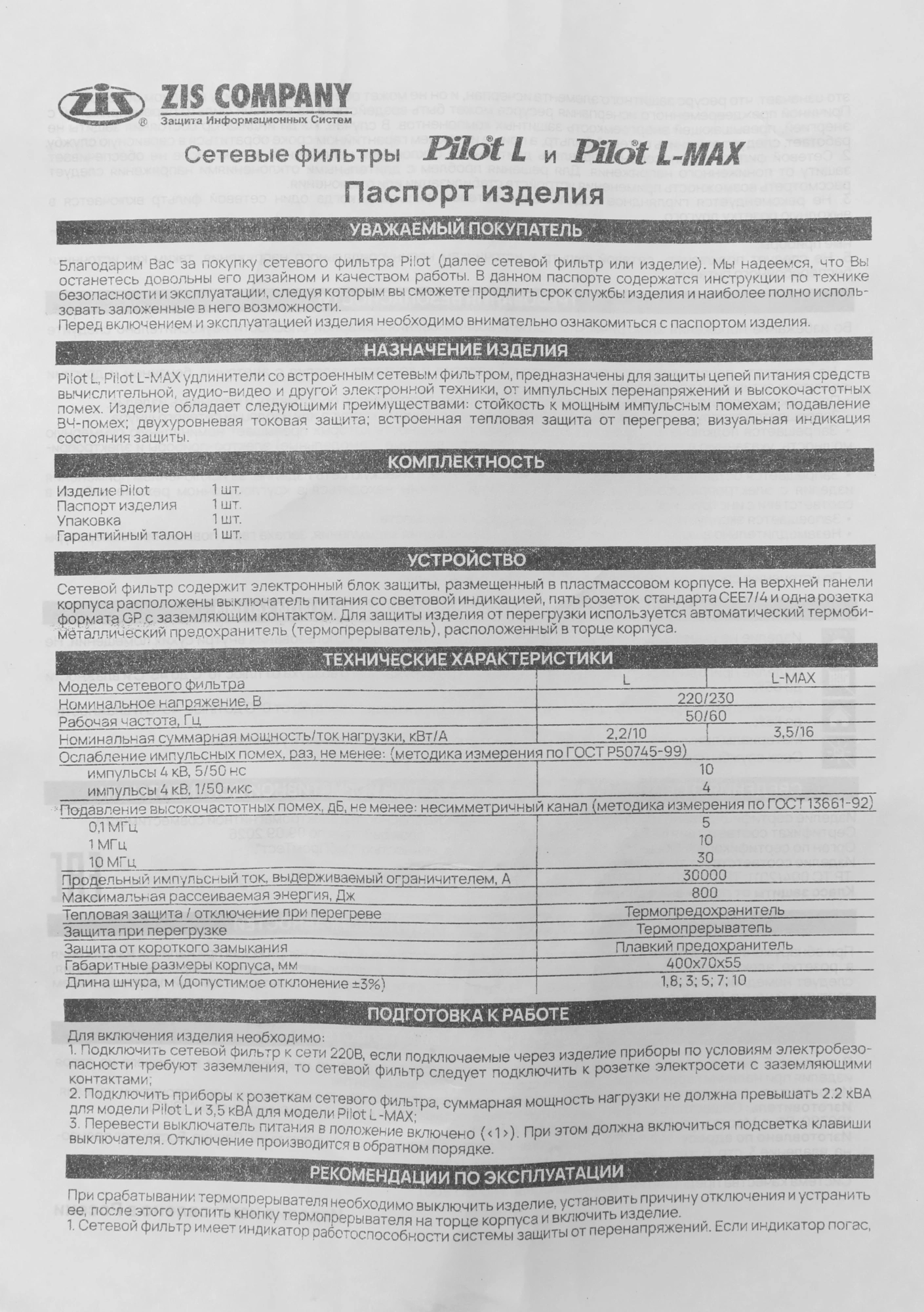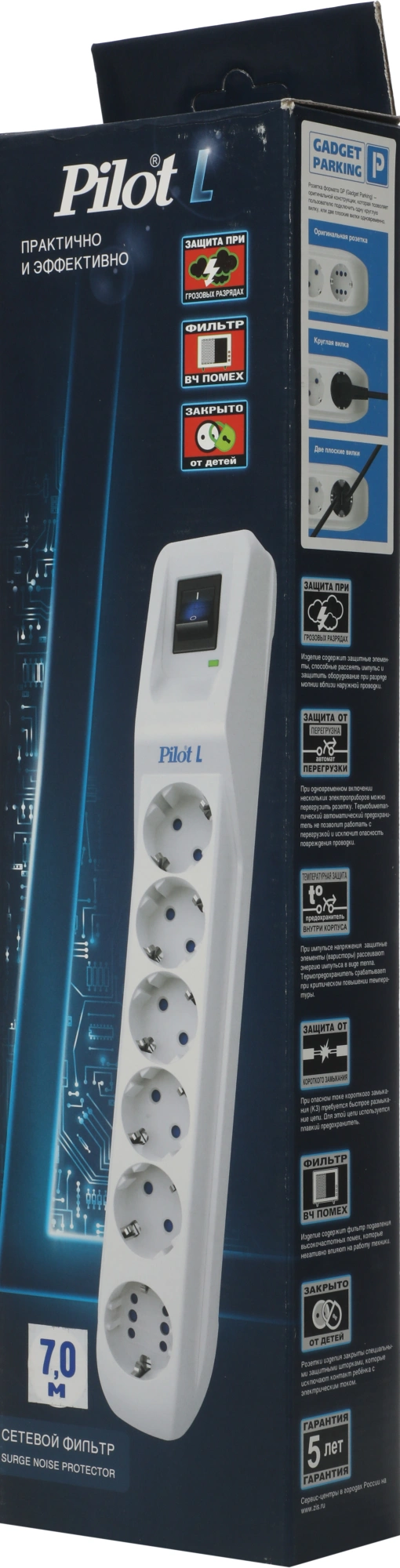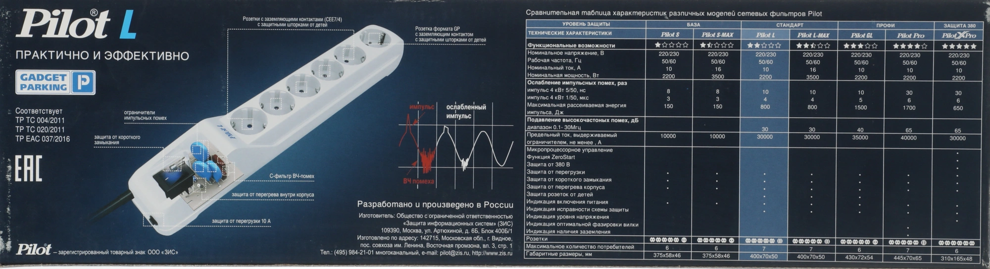 три варисторных ограничителя для защиты от импульсных скачков напряжения; емкостной фильтр для подавления ВЧ-помех (АЧХ фильтра); термопредохранитель для защиты от перегрева внутри корпуса; плавкий предохранитель для защиты от короткого замыкания; автоматический термобиметаллический предохранитель.