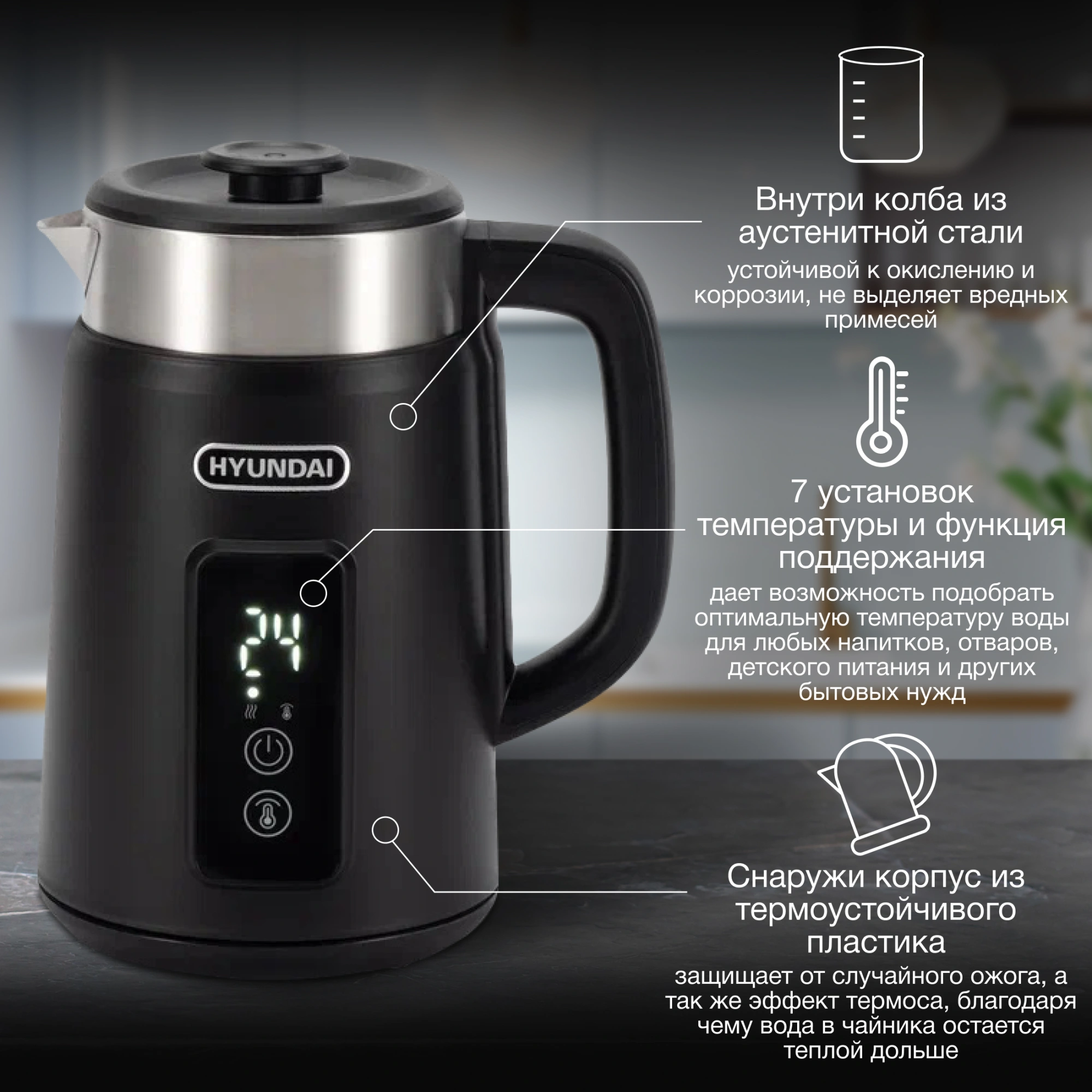 Электрический чайник с электронным управлением и регулировкой температуры Hyundai HYK-S3505 позволяет готовить в полном соответствии с рецептурой любые сорта чая, настои, отвары и детские смеси. Сочетание небольшого объема 1,5 л, нагревательного элемента мощностью 2200 Вт и корпуса с двойными стенками обеспечивает быстрый нагрев и сохранение температуры воды в течение продолжительного времени.