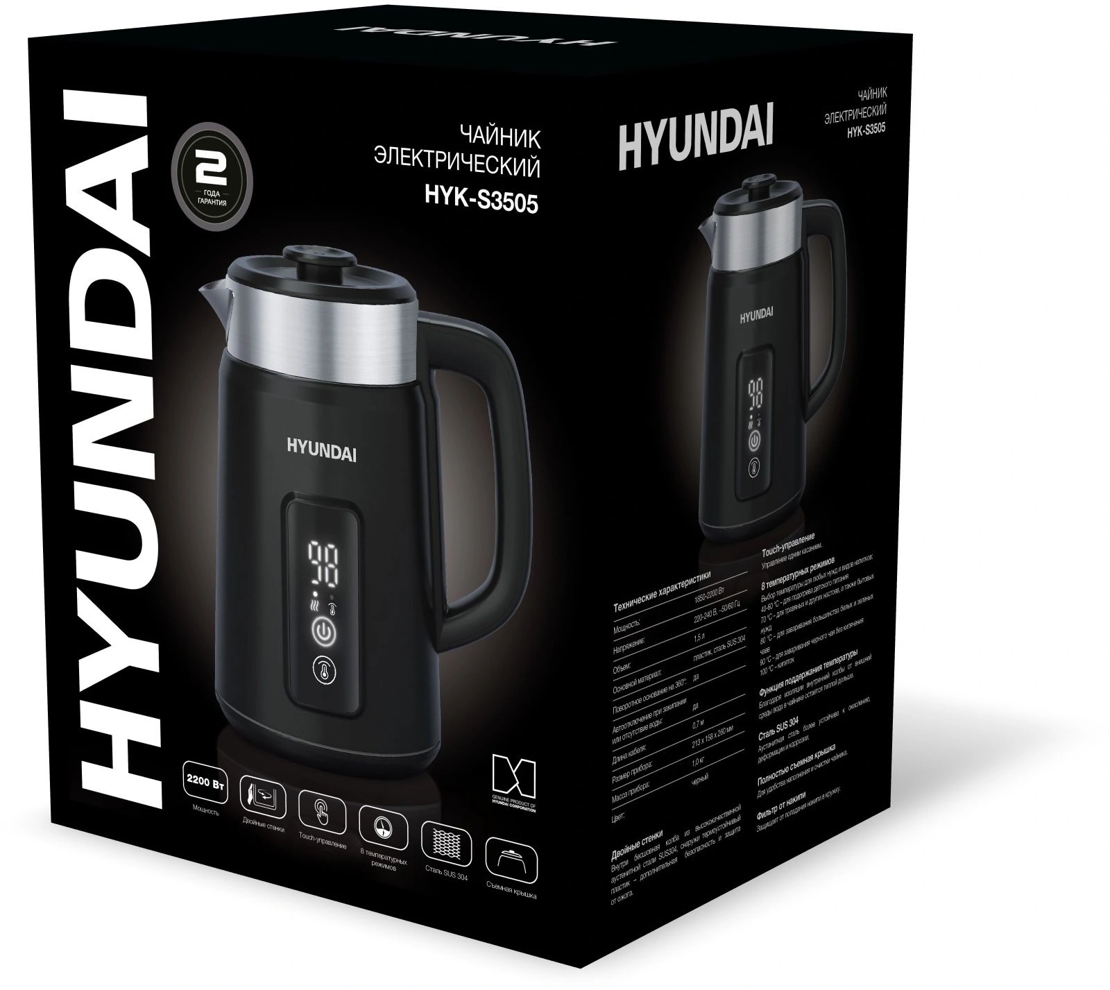 Hyundai HYK-S3505 – электрический чайник в стиле Hi-Tech со светящейся сенсорной панелью управления, цифровым дисплеем, регулируемой температурой нагрева и функцией поддержания тепла. Модель имеет теплоизолированный корпус, обеспечивающий более эффективный нагрев и безопасность эксплуатации, а также съемную крышку для более удобного наполнения и ухода.