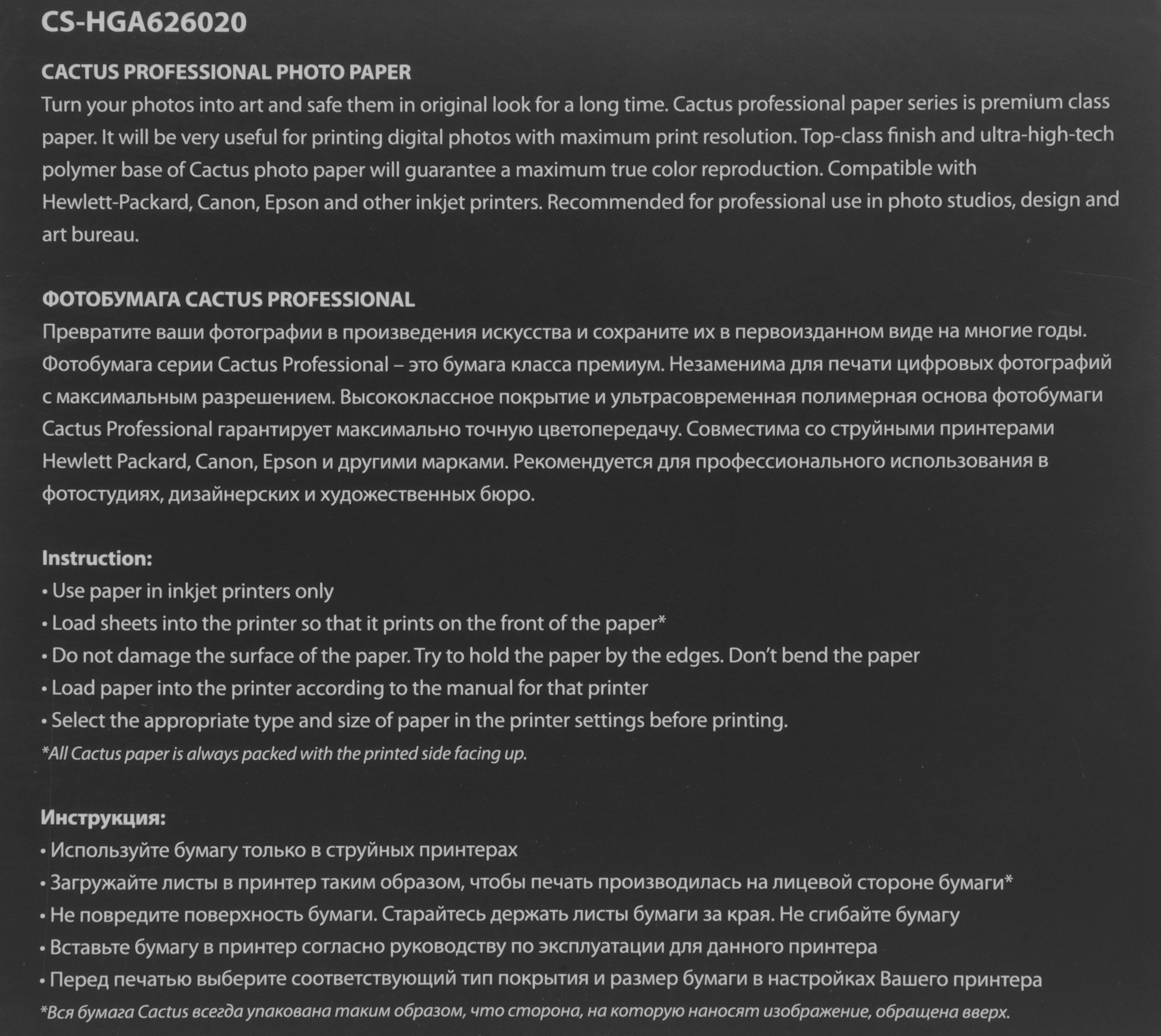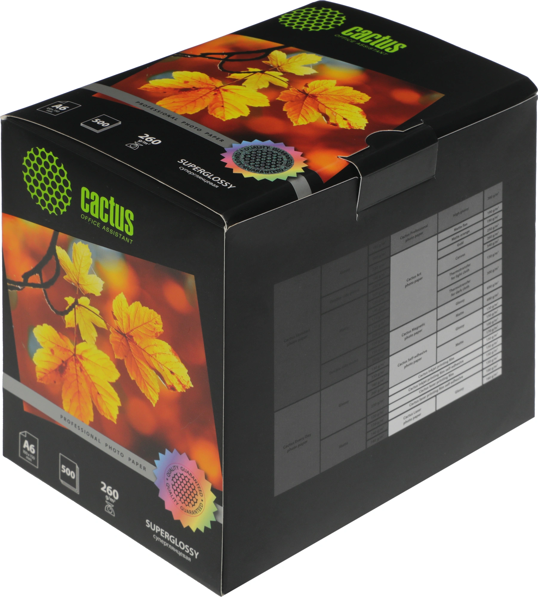Суперглянцевая фотобумага Cactus серии Professional для струйной печати – бумага премиального качества. Благодаря своему особому покрытию обладает бо́льшим блеском и гладкостью, что позволяет получить более яркие фотографии, чем при печати на стандартной глянцевой бумаге. Идеально подходит в тех случаях, когда Вам требуется получить максимально насыщенные цветом снимки: для высококачественной фотопечати, в том числе в домашних условиях, а также для огромного спектра задач, требующих изображений высокого качества.