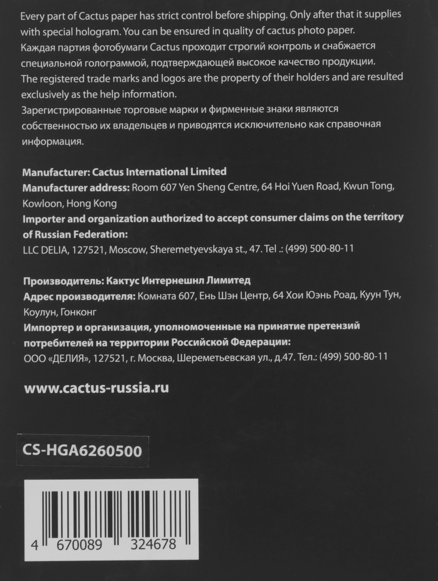 CS-HGA6260500 A6/260г/м2/500л./белый глянцевое для...