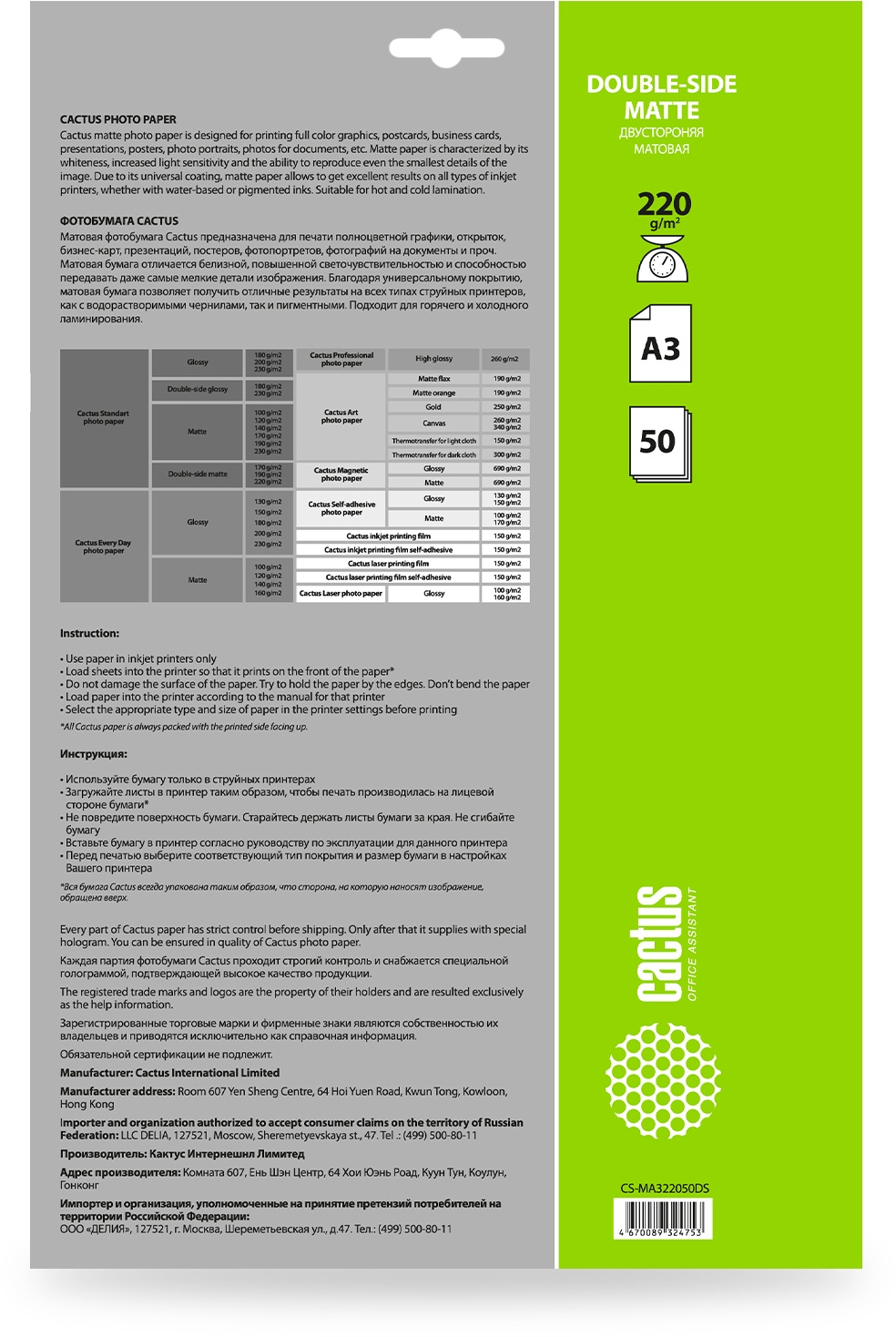 Двусторонняя матовая фотобумага Cactus серии Standard хорошо подойдет для печати рекламной и сувенирной продукции, открыток, пригласительных на торжества, составления уникальных домашних фотоальбомов, бизнес-карт, презентаций и проч. Матовая бумага отличается белизной, повышенной светочувствительностью и способностью передавать даже самые мелкие детали изображения. Благодаря универсальному покрытию, матовая бумага позволяет получить отличные результаты на всех типах струйных принтеров, как с водорастворимыми чернилами, так и пигментными. Подходит для горячего и холодного ламинирования.