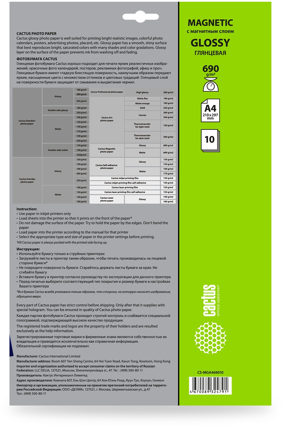 Глянцевая фотобумага с магнитным слоем Cactus для струйных принтеров. Идеально подходит для печати календарей, фотографий, расписаний, заметок, рекламной продукции, обучающих материалов, авторских сувениров и проч. Легко крепится на холодильники, металлические демонстрационные доски, корпуса компьютеров и другие металлические поверхности.