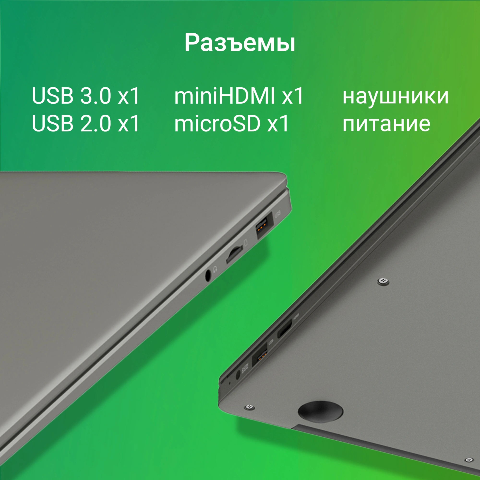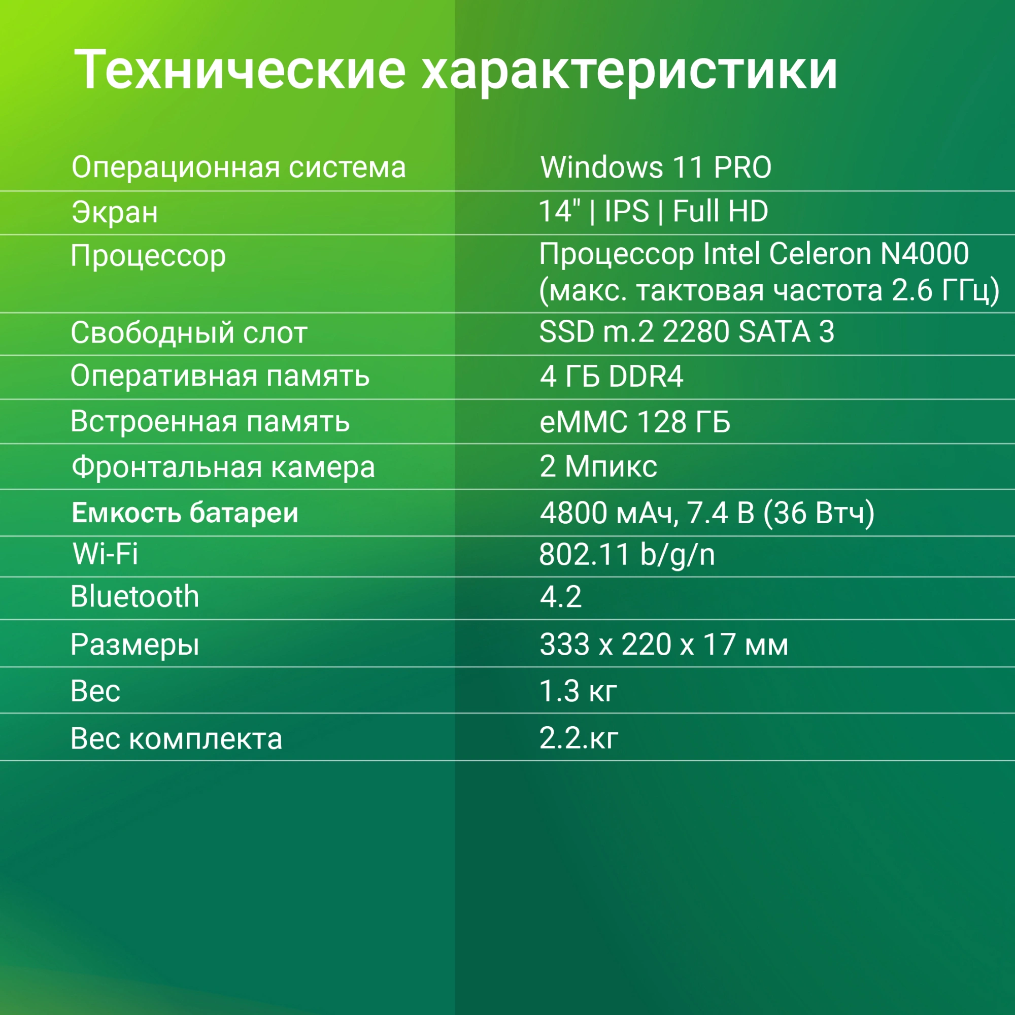 Ноутбук оснащён 2-ядерным процессором Intel Celeron N4000 с интегрированной видеокартой Intel UHD Graphics 600. Объем встроенного накопителя eMMC составляет 128 ГБ, оперативной памяти - 4 ГБ. Таких ресурсов достаточно для создания и редактирования документов и презентаций, работы в браузере и воспроизведения медиаконтента.