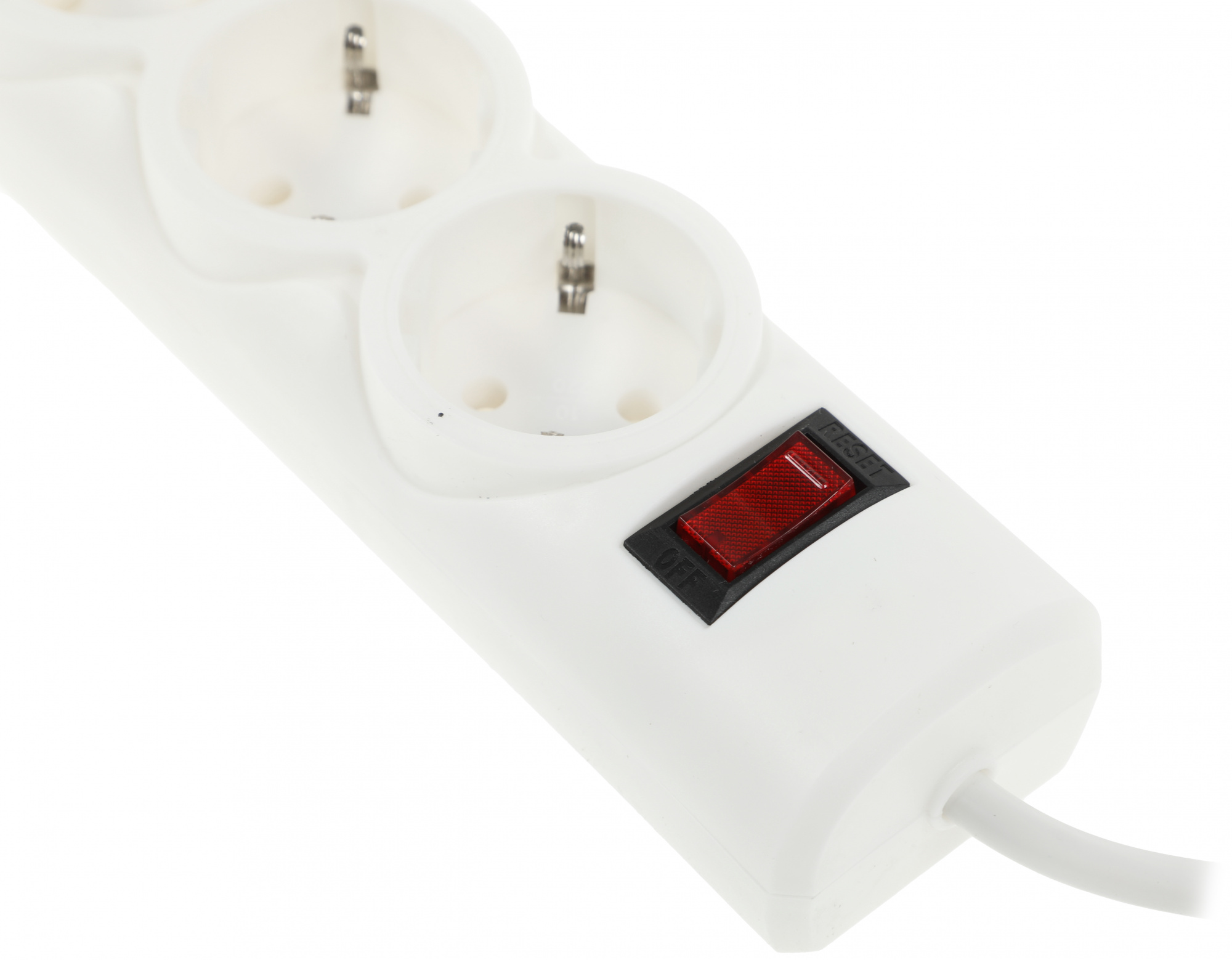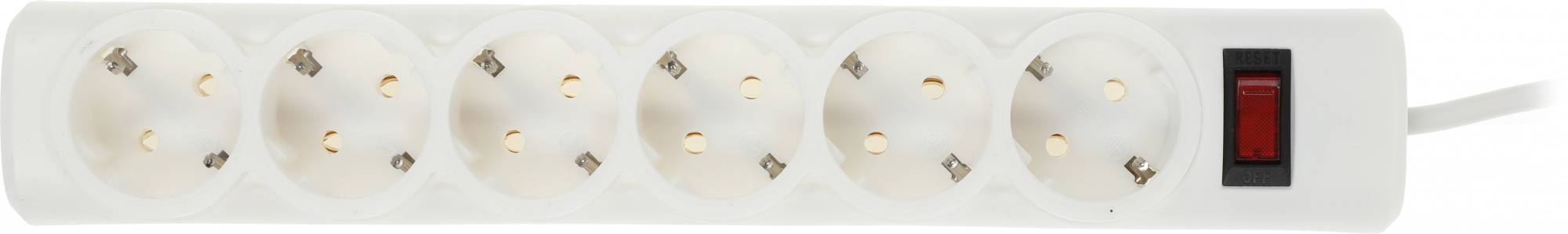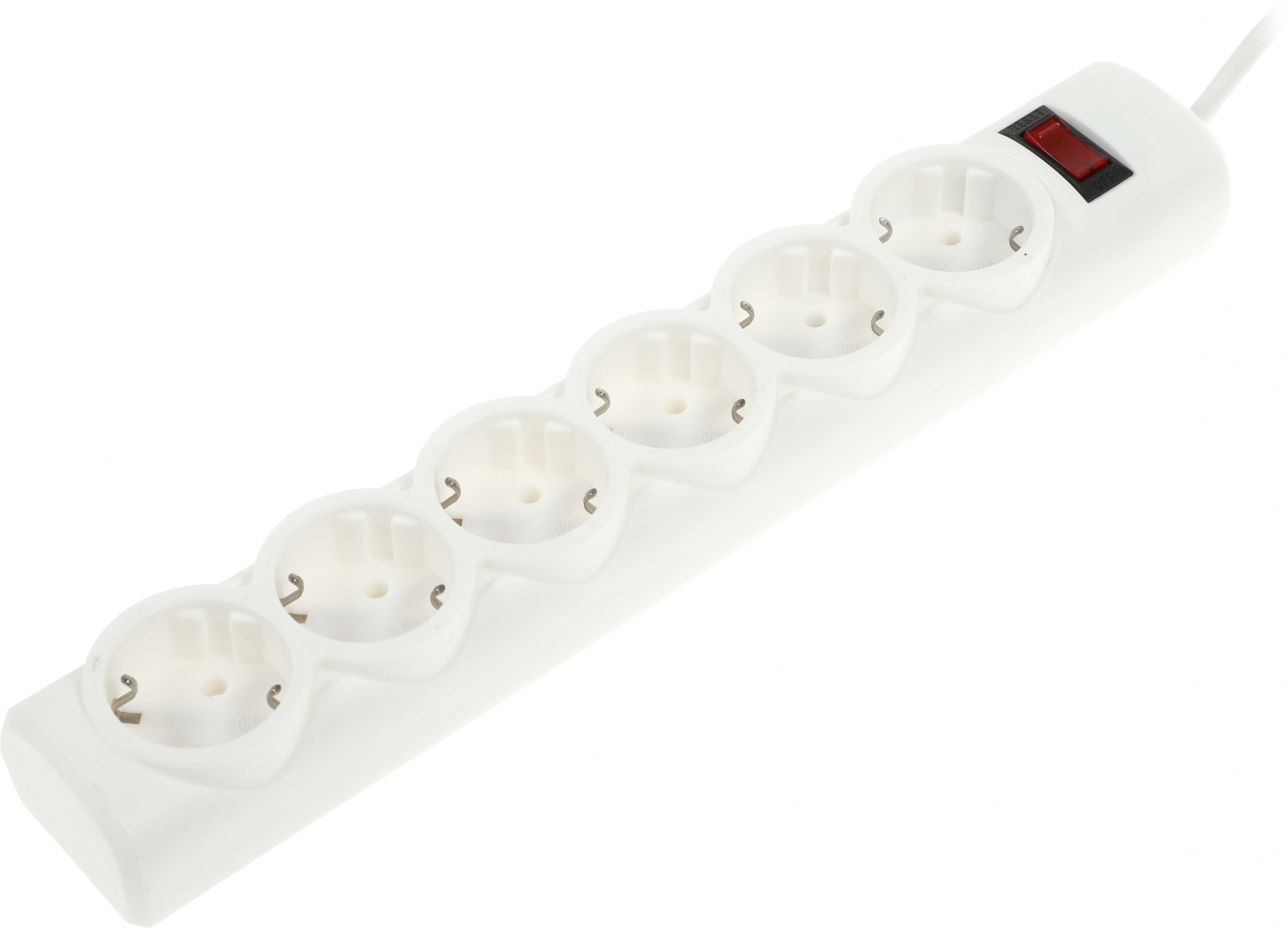 6 розеток с заземлением. Автоматический предохранитель, встроенный в выключатель. Защита от перегрузки и короткого замыкания. Крепление на стену. Корпус из негорючего пластика.