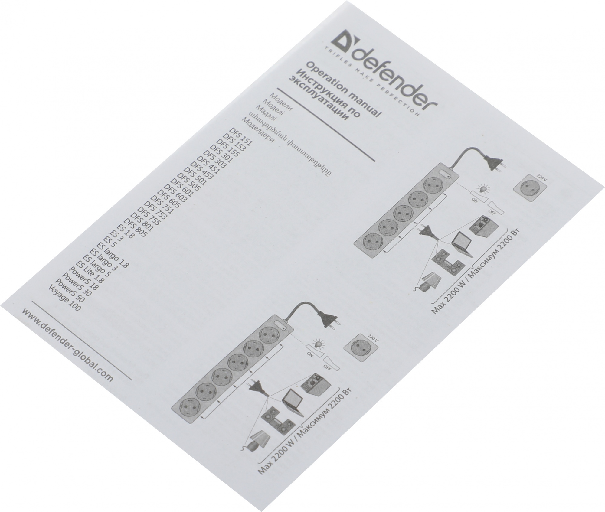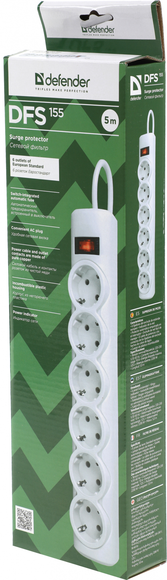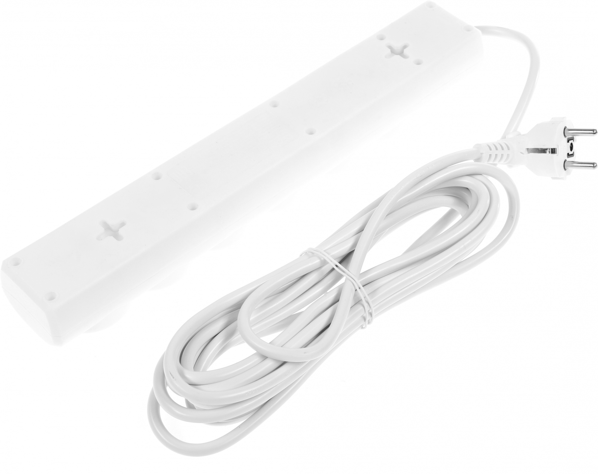 6 розеток с заземлением. Автоматический предохранитель, встроенный в выключатель. Защита от перегрузки и короткого замыкания. Крепление на стену. Корпус из негорючего пластика.