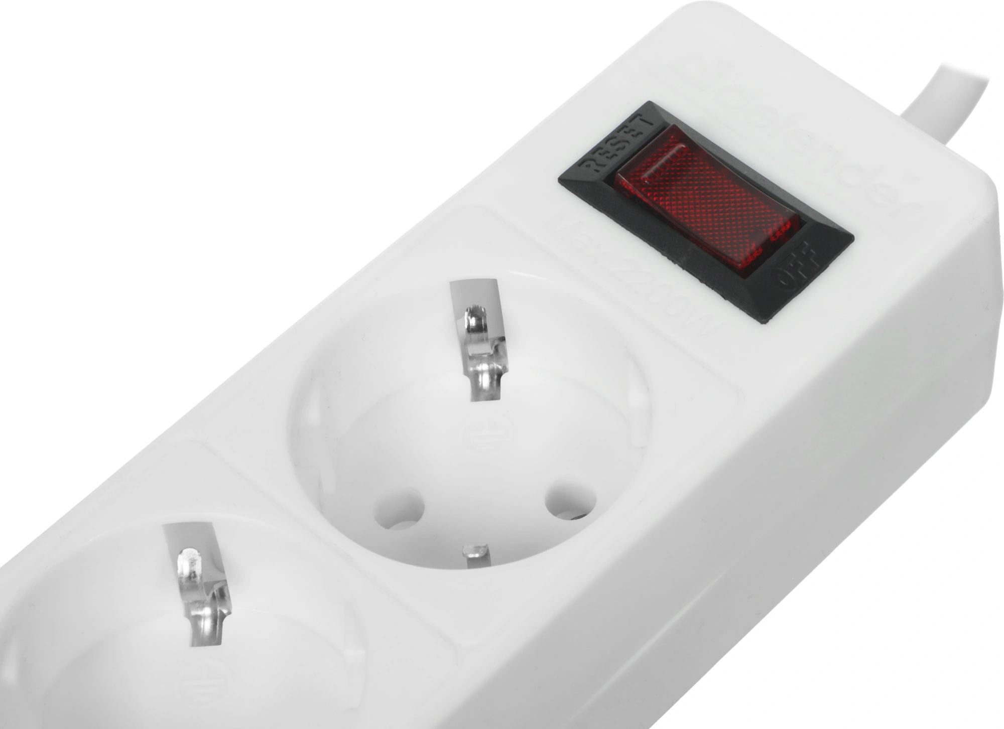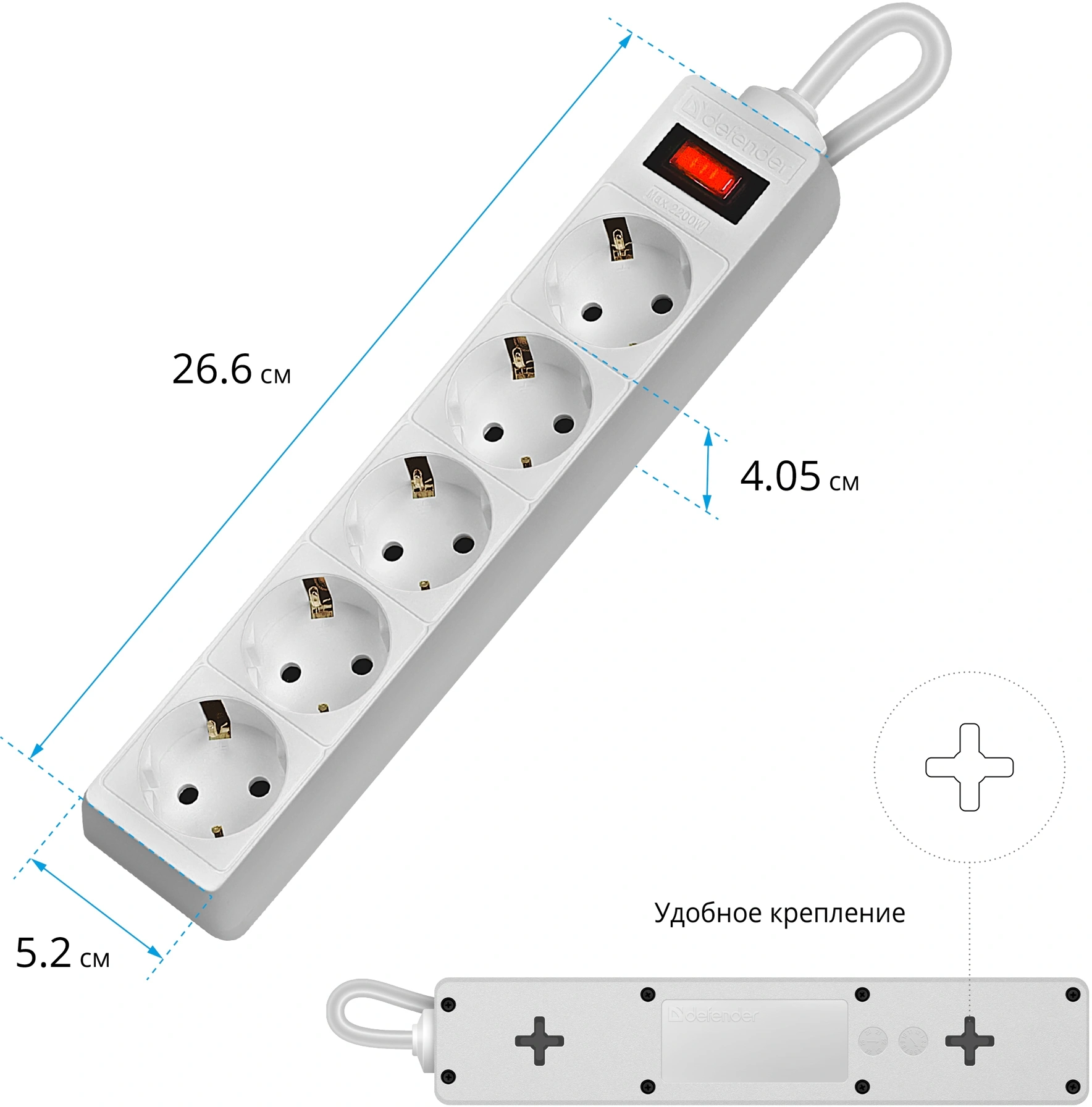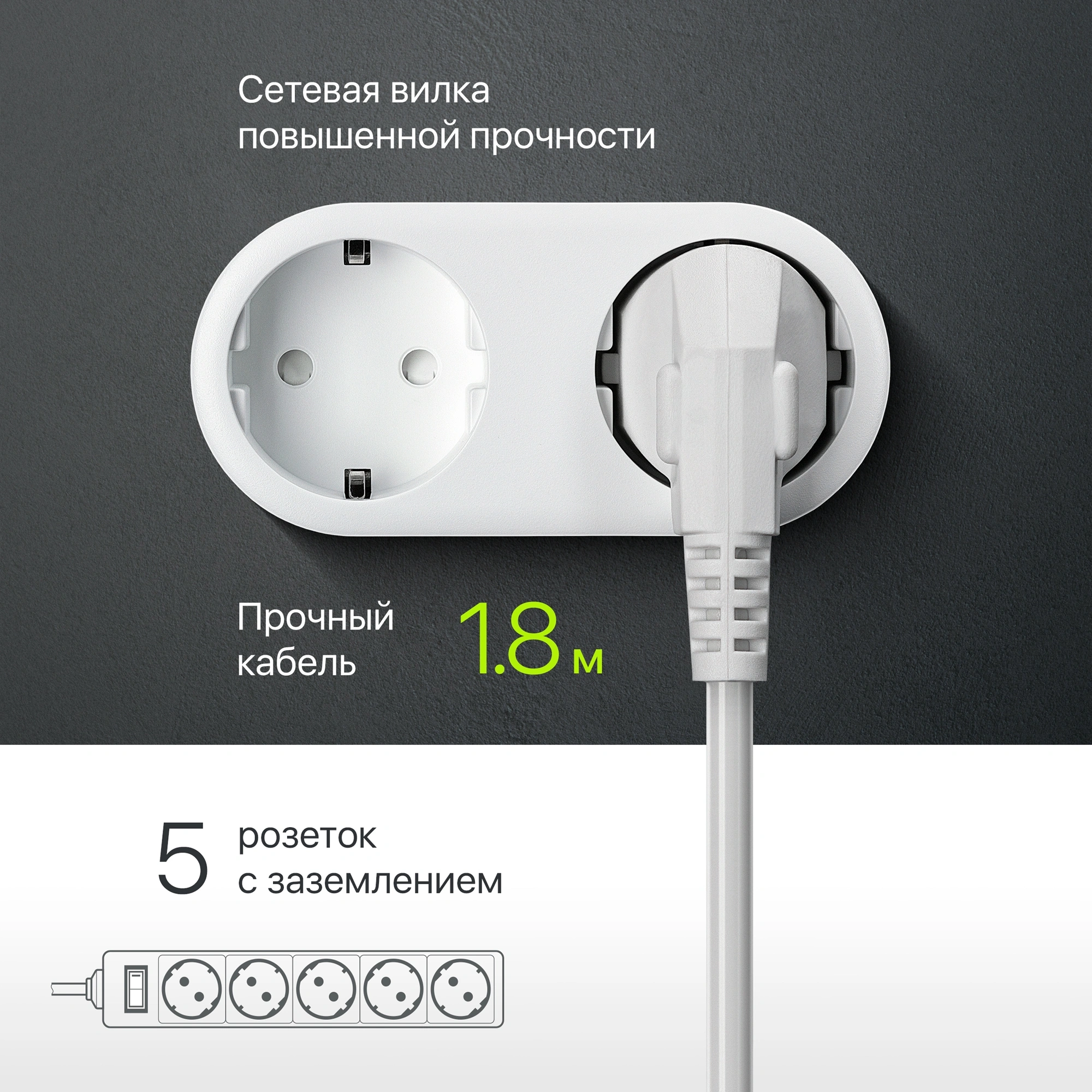 Автоматический предохранитель, встроенный в выключатель. Защита от перегрузки и короткого замыкания. Защита от импульсных помех. Индикатор сети. Крепление на стену. Корпус из негорючего пластика.