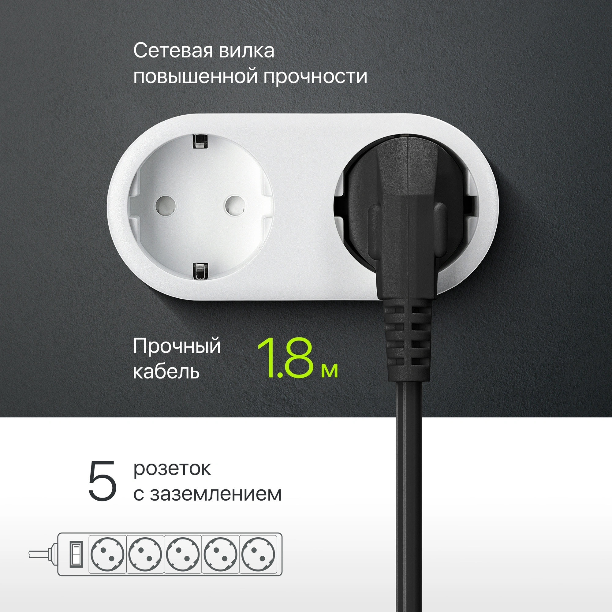Автоматический предохранитель, встроенный в выключатель. Защита от перегрузки и короткого замыкания. Защита от импульсных помех. Индикатор сети. Крепление на стену. Корпус из негорючего пластика.