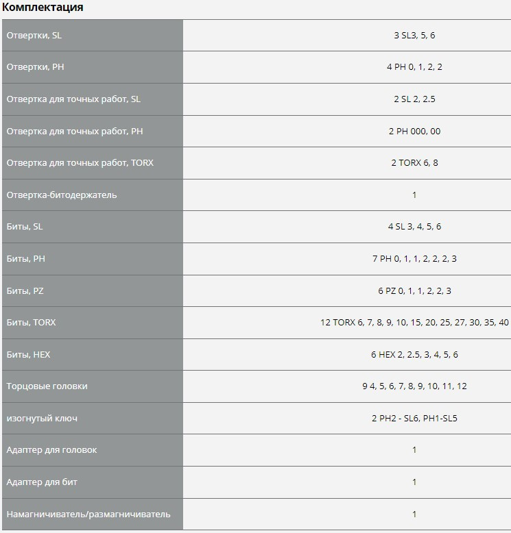 набор бит H/HEX (шестигранник), набор бит Ph (крест), набор бит Pz (крест), набор бит SL (шлиц), набор бит Torx