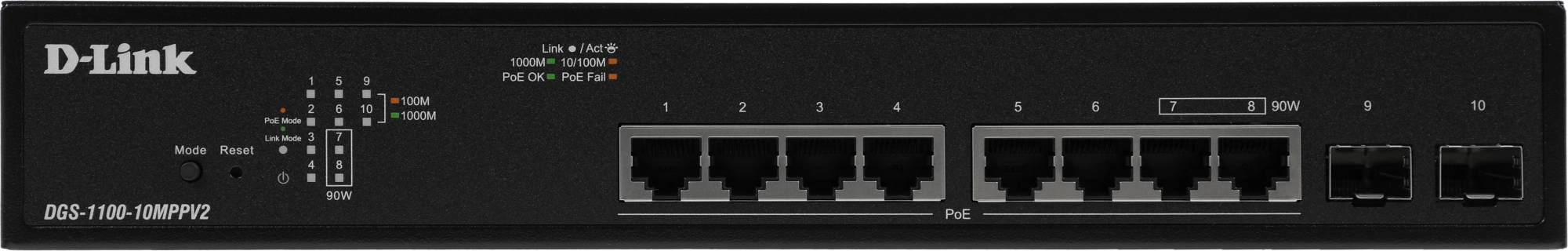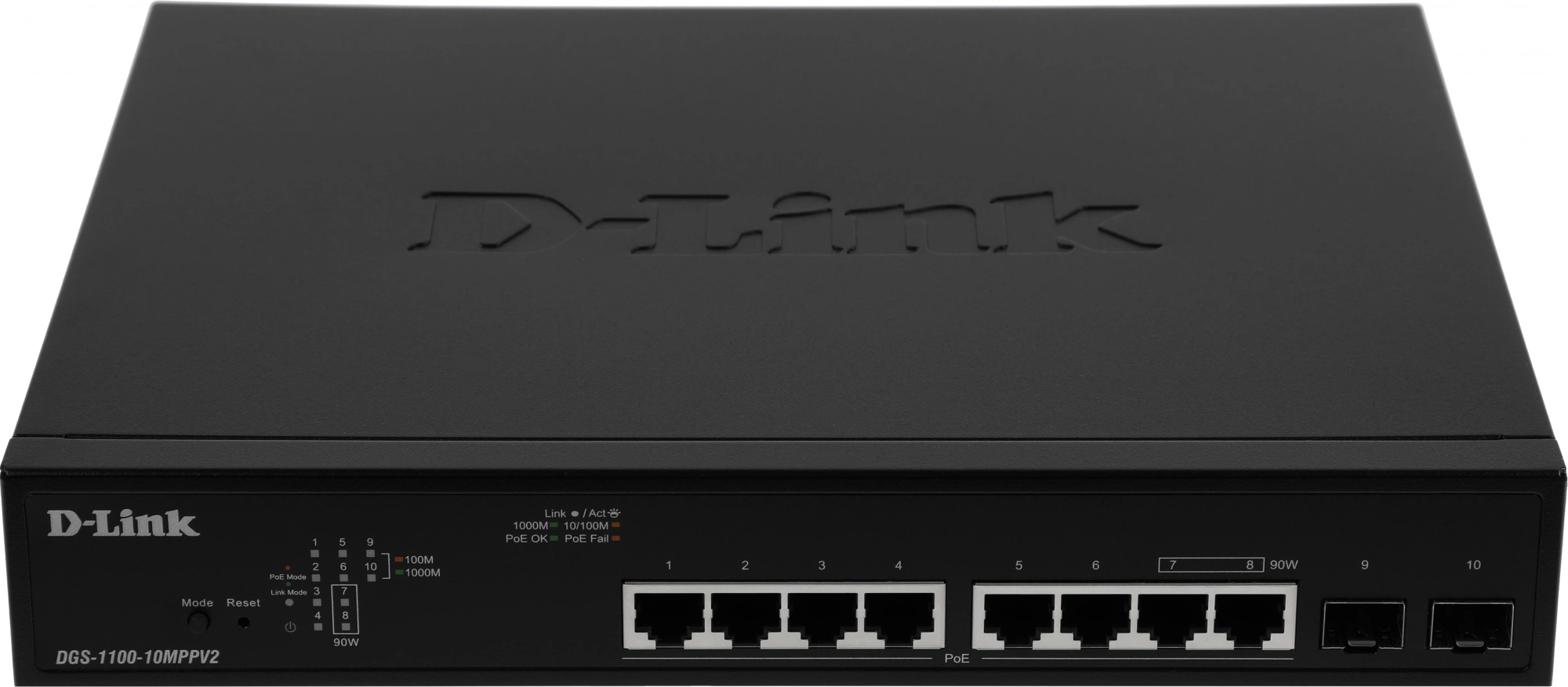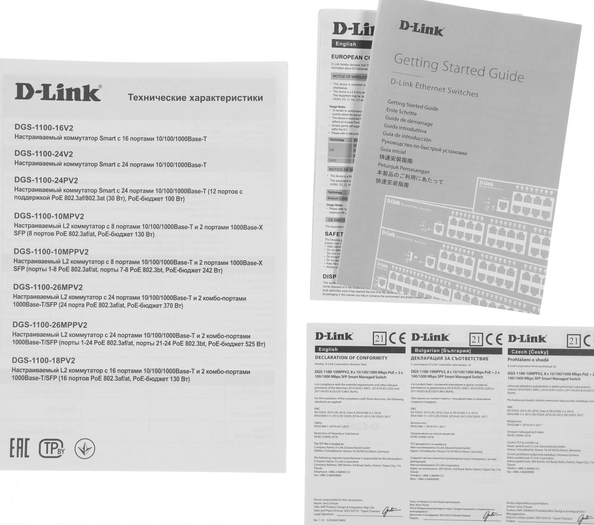Коммутатор DGS-1100-10MPPV2, кабель питания, 2 крепежных кронштейна для установки в 19-дюймовую стойку, 4 резиновые ножки, комплект для монтажа, краткое руководство по установке.