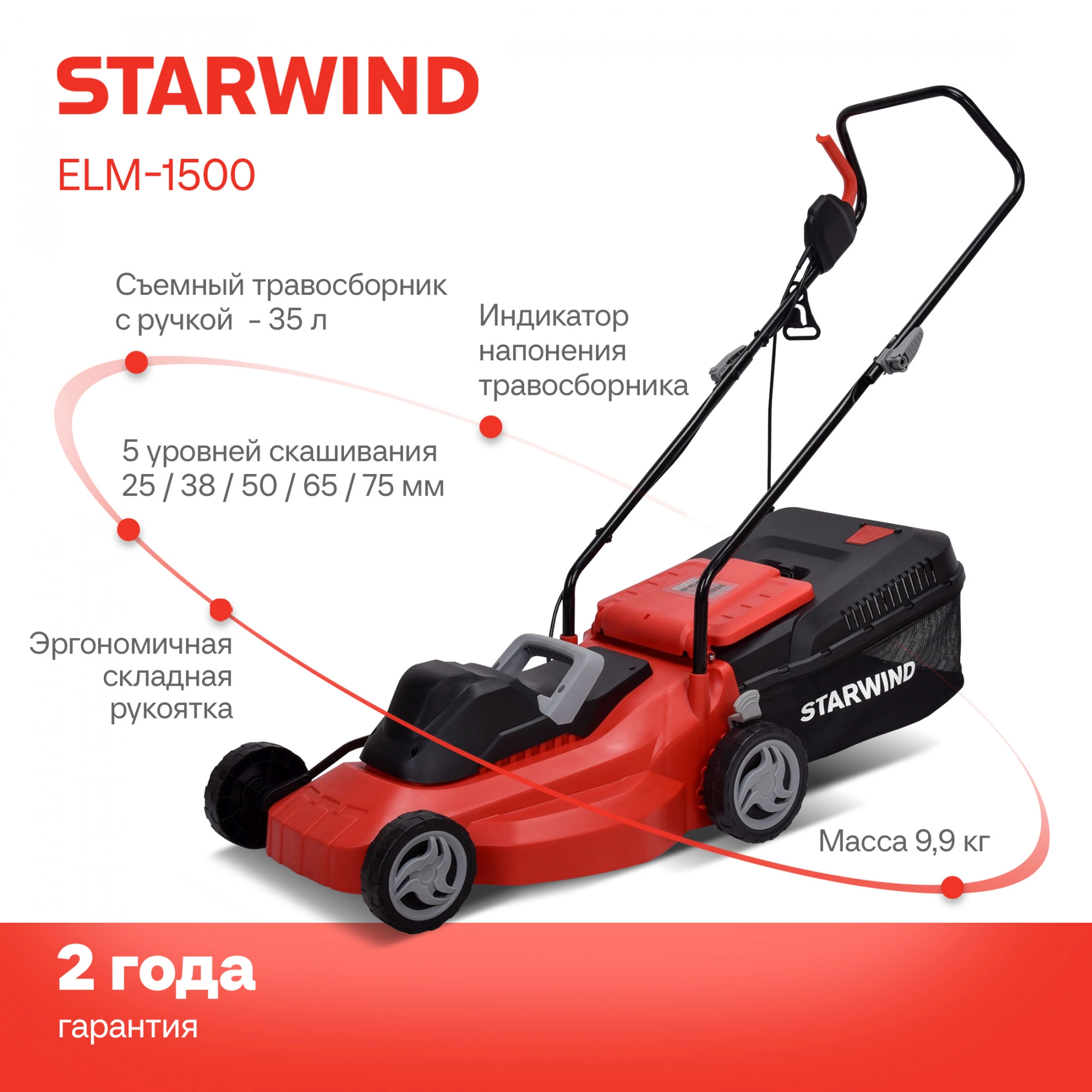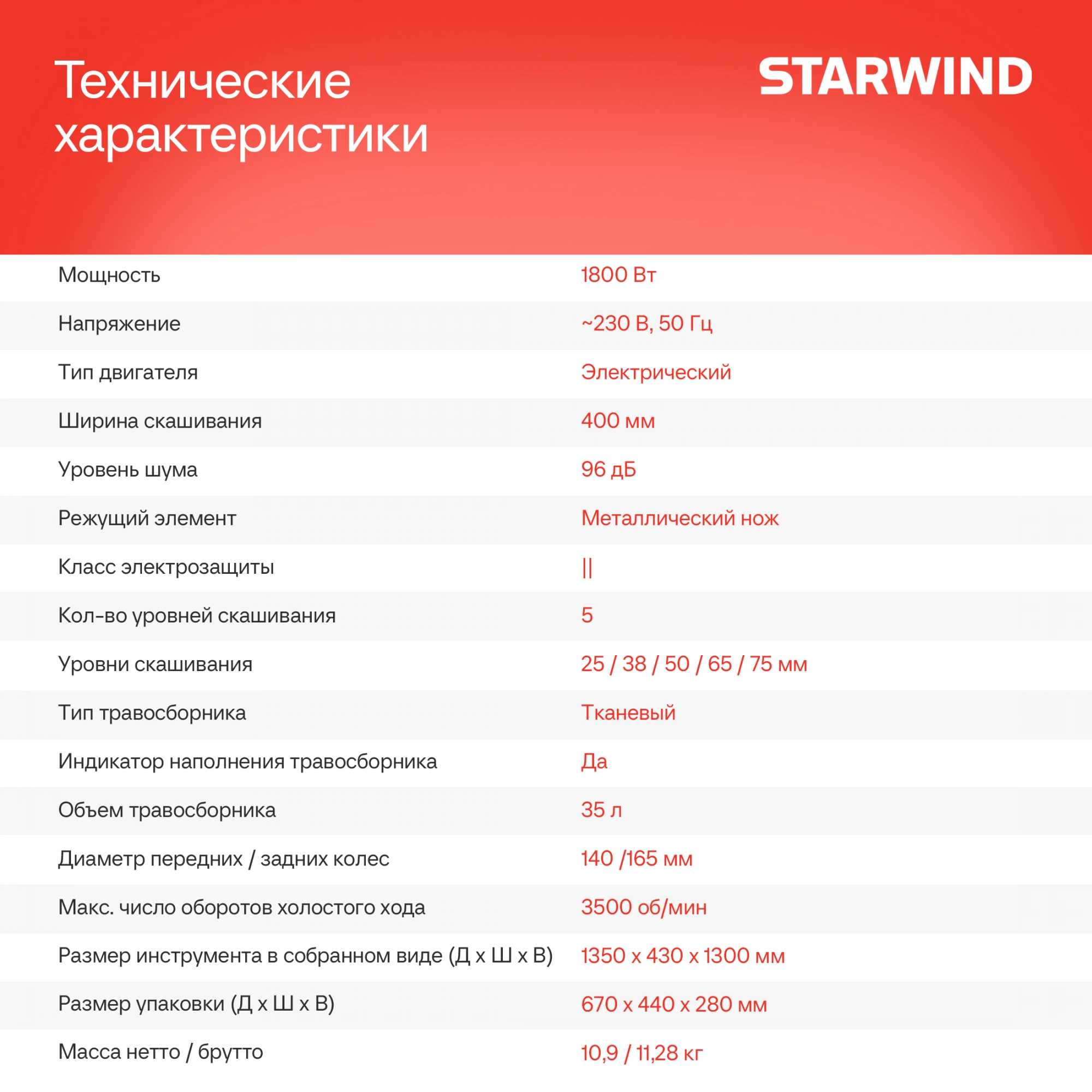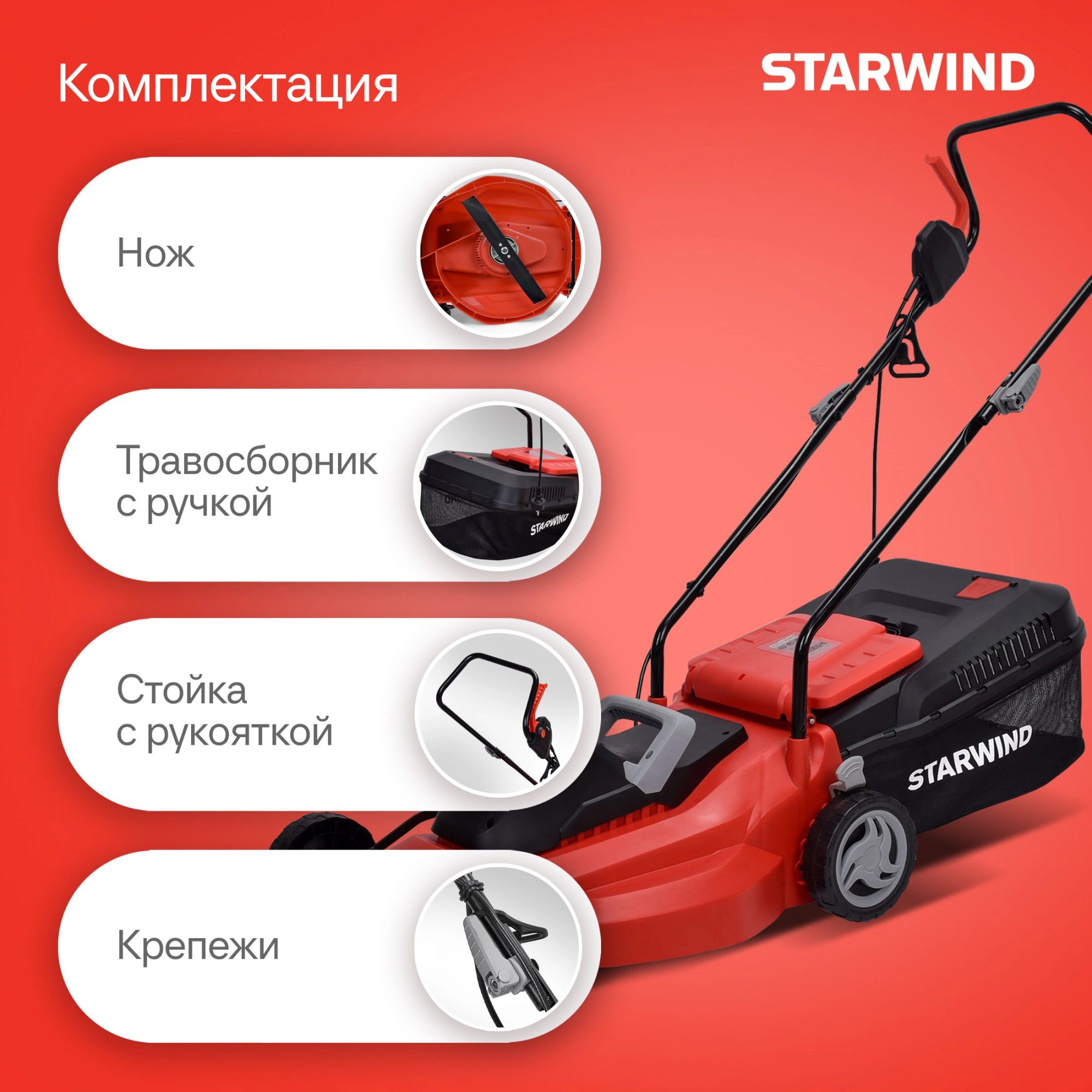 Газонокосилка Starwind ELM-1800 — это надежная и эффективная модель, которая поможет вам ухаживать за газоном и поддерживать его в идеальном состоянии. С ее помощью вы сможете быстро скосить траву на большой площади, при этом получив ровный и аккуратный газон.