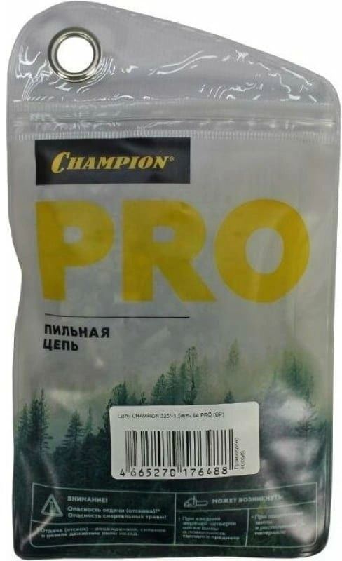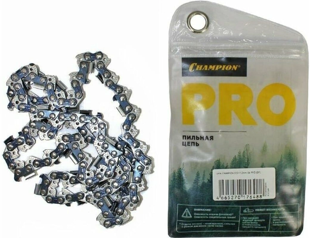 Цепь (0.325"; 1.5 мм; 64 зв.) CHAMPION B058-BP-64E с чипперными режущими звеньями и рабочими углами небольшого радиуса скругления, быстро выполняющими резку и легко затачиваемыми. В ведущих звеньях выштампованы специальные каналы.