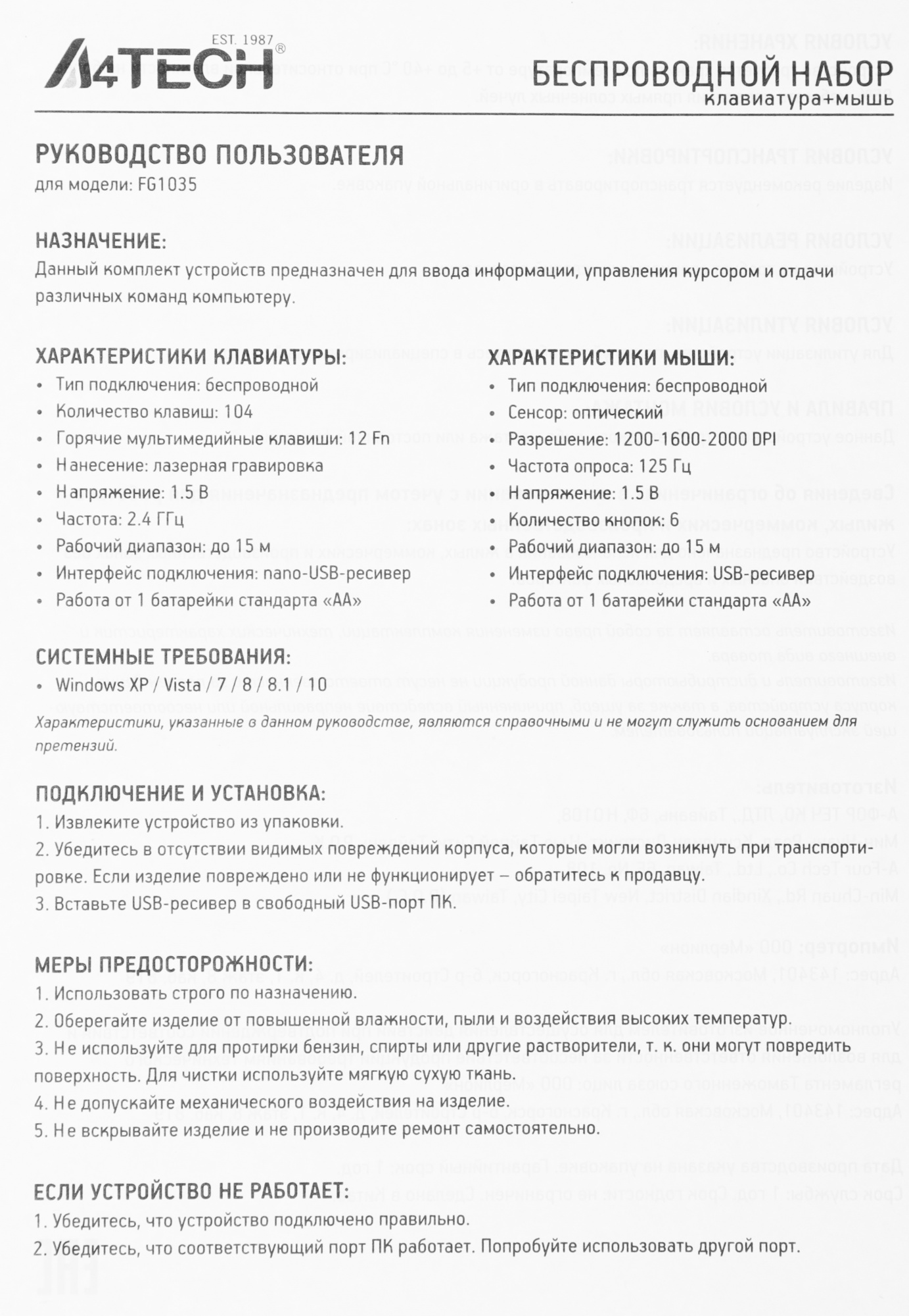 Основные характеристики