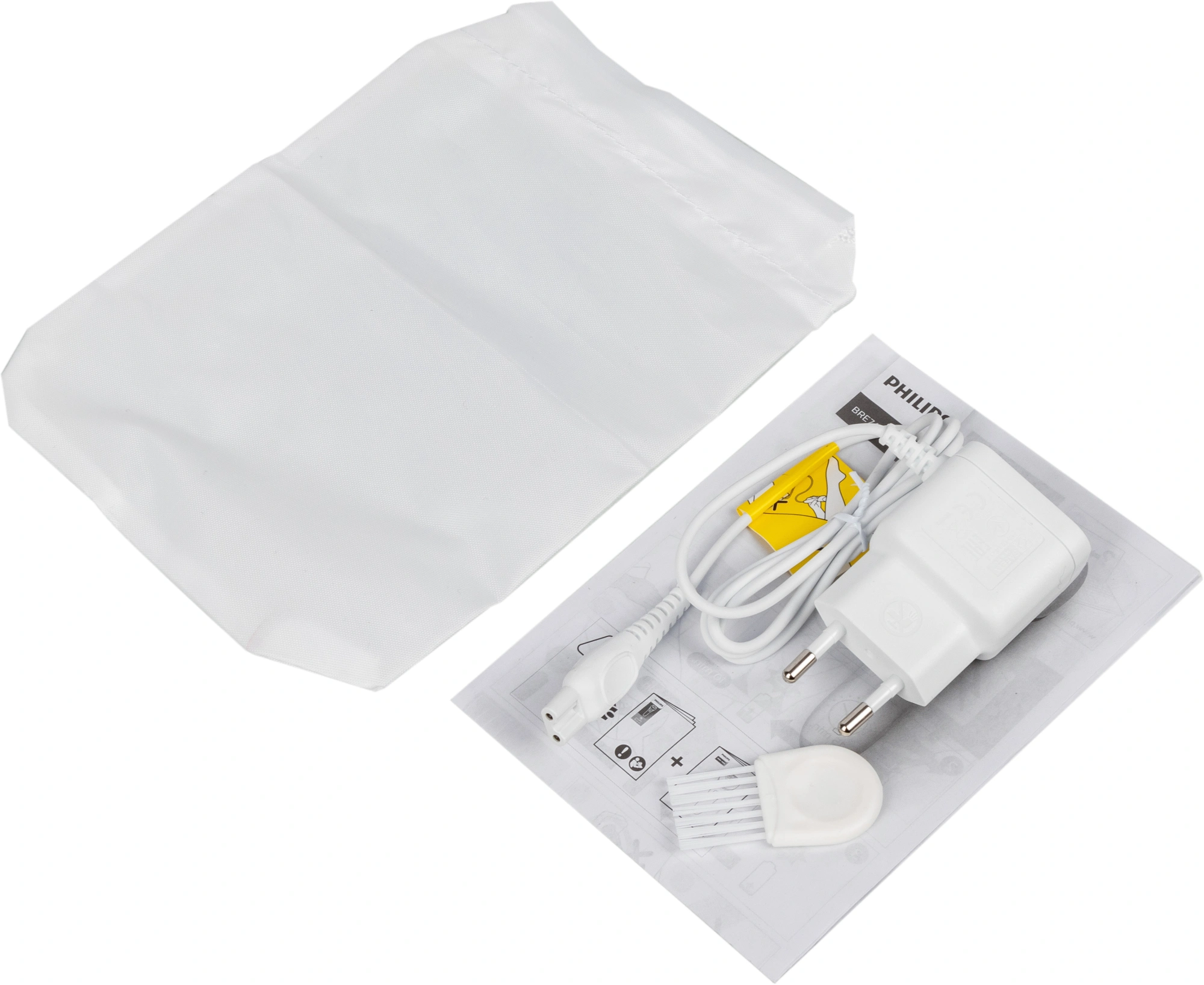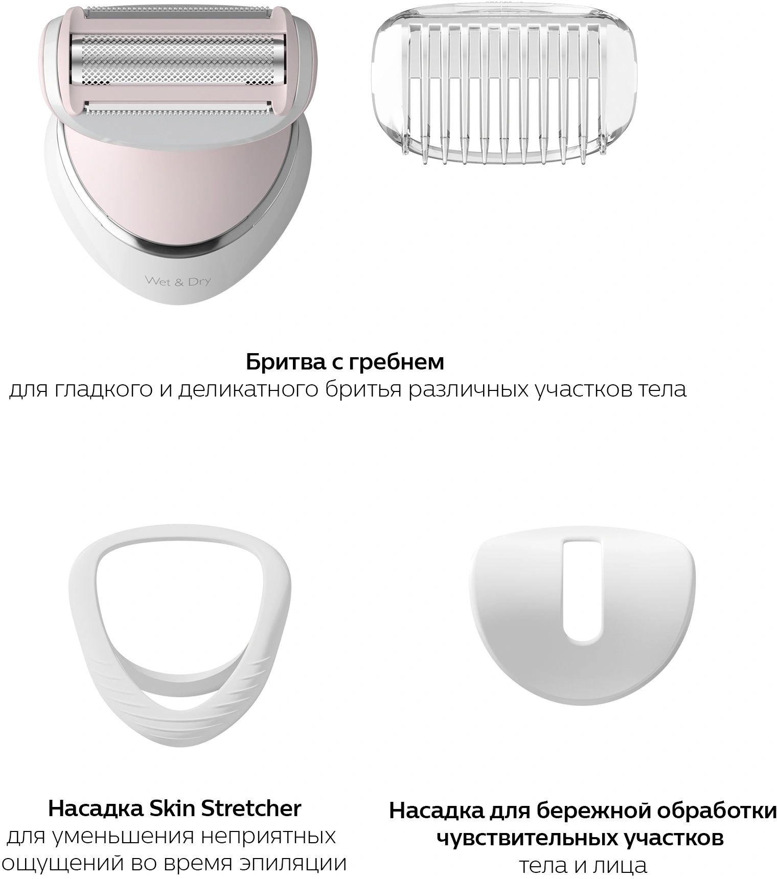 В комплекте: бритвенная головка, насадка-гребень, насадка для чувствительных участков, насадка для оптимального контакта, чехол, щеточка для чистки