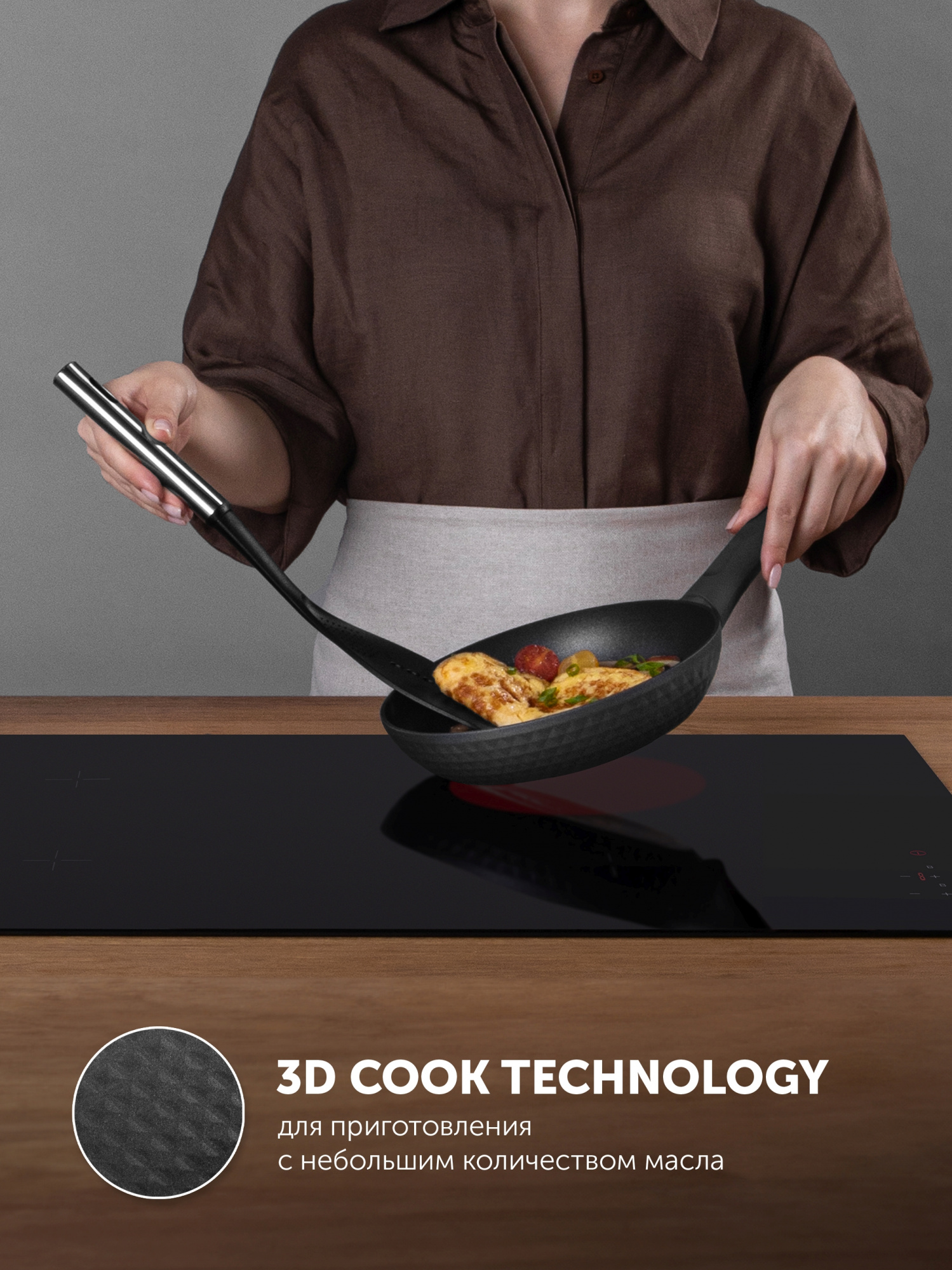 3D COOK Technology - для приготовления с низким содержанием жира. Внутреннее покрытие - двухслойное высокопрочное утолщенное антипригарное покрытие Pfluon. Термостойкое внешнее покрытие. Ручка - эргономичная бакелитовая ручка с покрытием "Soft Touch". Подходит для всех типов плит, включая индукцию.