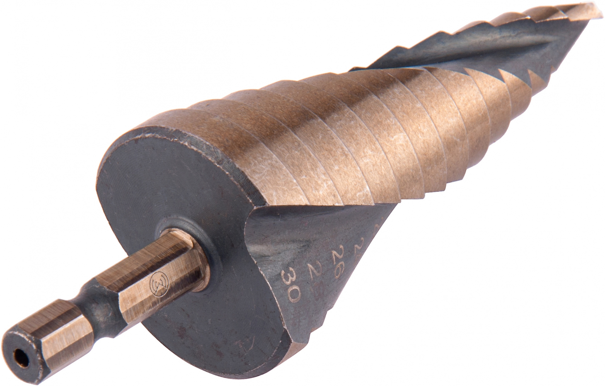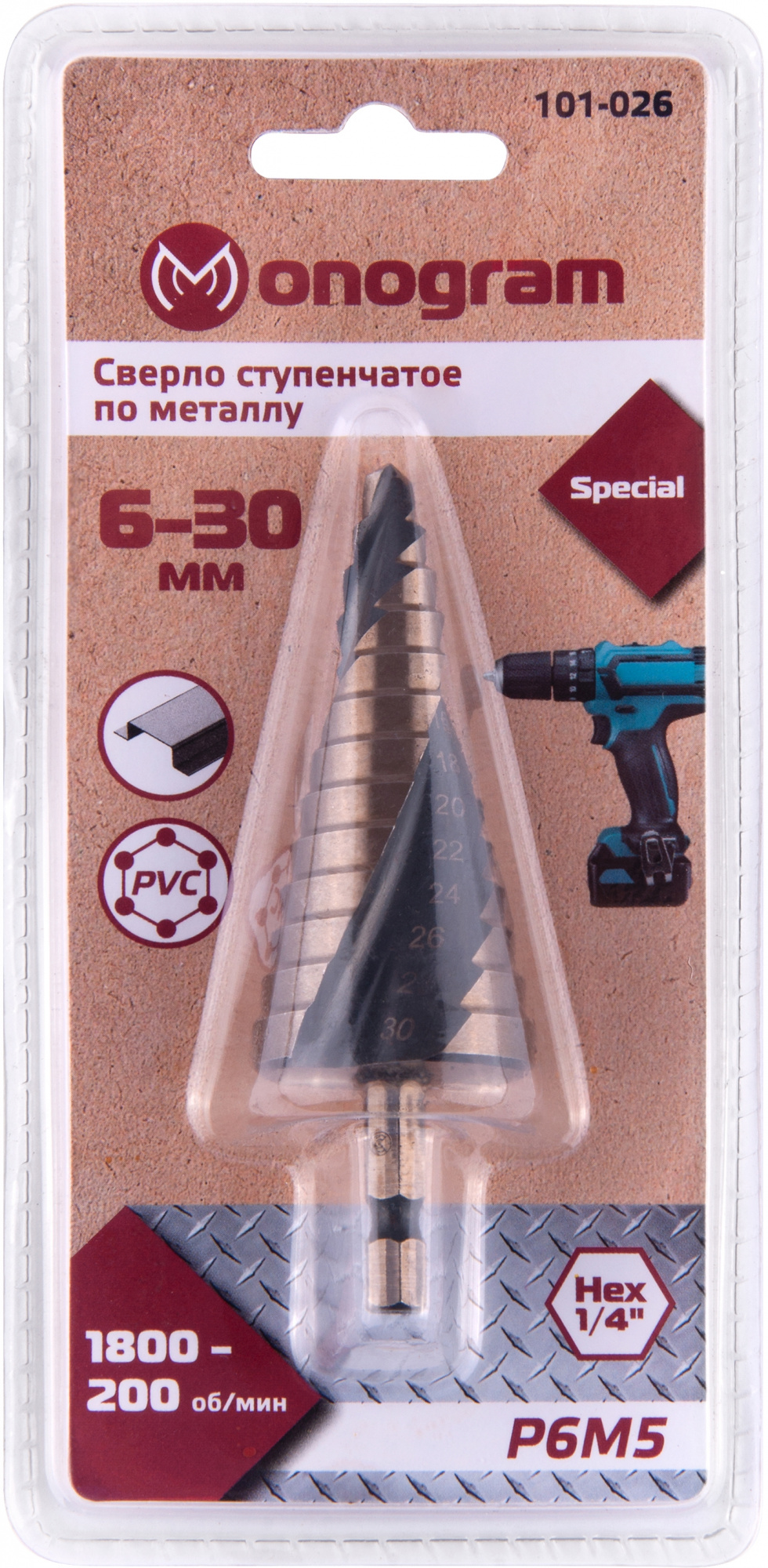 Сверло MONOGRAM Special по металлу имеет 13 ступеней: 6, 8, 10, 12, 14, 16, 18, 20, 22, 24, 26, 28, 30 мм. конусное предназначено для сверления отверстий в листовых металлических и пластиковых материалах. Изготовлено из комплексно-легированной стали P6M5.