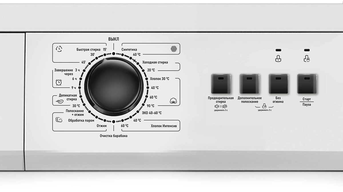 Синтетика, Холодная стирка, Хлопок, Хлопок Интенсив, ЭКО 40-60 °С, Очистка барабана, Отжим, Полоскание и отжим, Деликатная стирка, Быстрая стирка 45/30/15