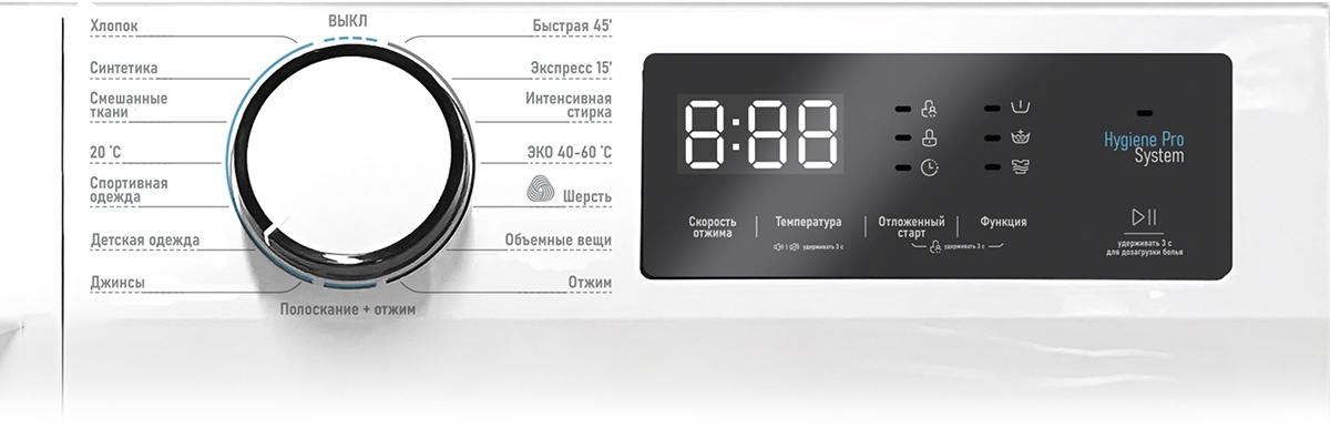 Быстрая стирка 45/15, Интенсивная стирка, ЭКО 40-60 °С, Шерсть, Объемные вещи, Отжим, Полоскание и отжим, Джинсы, Детская одежда, Спортивная одежда, Холодная стирка, Смешанные ткани, Синтетика, Хлопок.